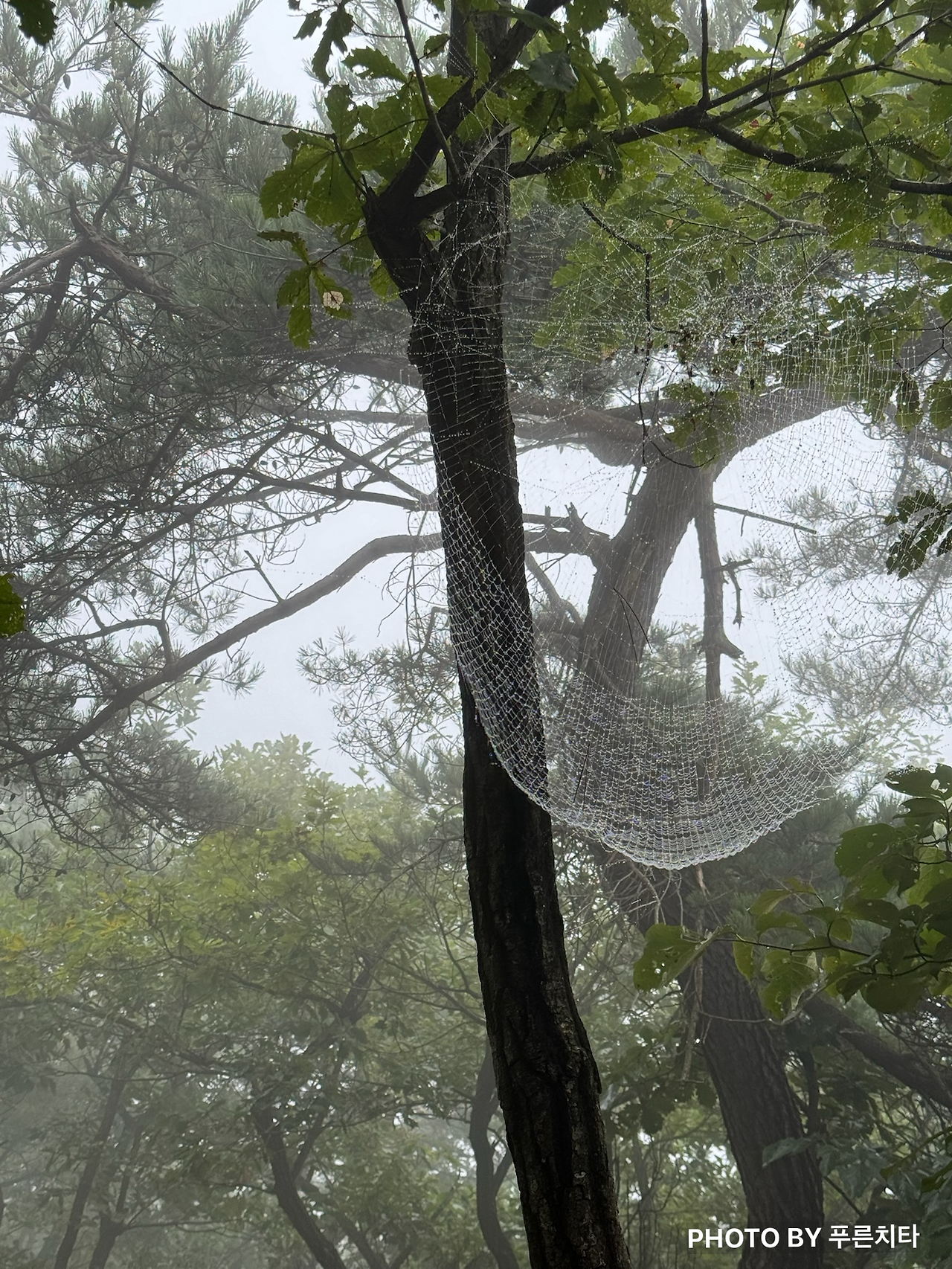 비 맞을 걸 감안하고 나온 게 아니니 처음엔 기분이 좋지 않았지만 금방 생각이 바뀌었다. 맑은 날씨엔 보지 못했던 게 눈에 들어왔기 때문이다. 거미줄에 빗방울이 맺히고, 그 무게에 축 쳐져있는 모습이 곳곳에 보였다. 산속이라 그런지 거미줄이 나무 높은 곳까지 많았고, 규모도 꽤 커서 그런지 두드러져 보였다. 안개가 살짝 낀 상태에서 보이는 모습은 약간 신비로운 느낌도 나면서 아름다웠다.