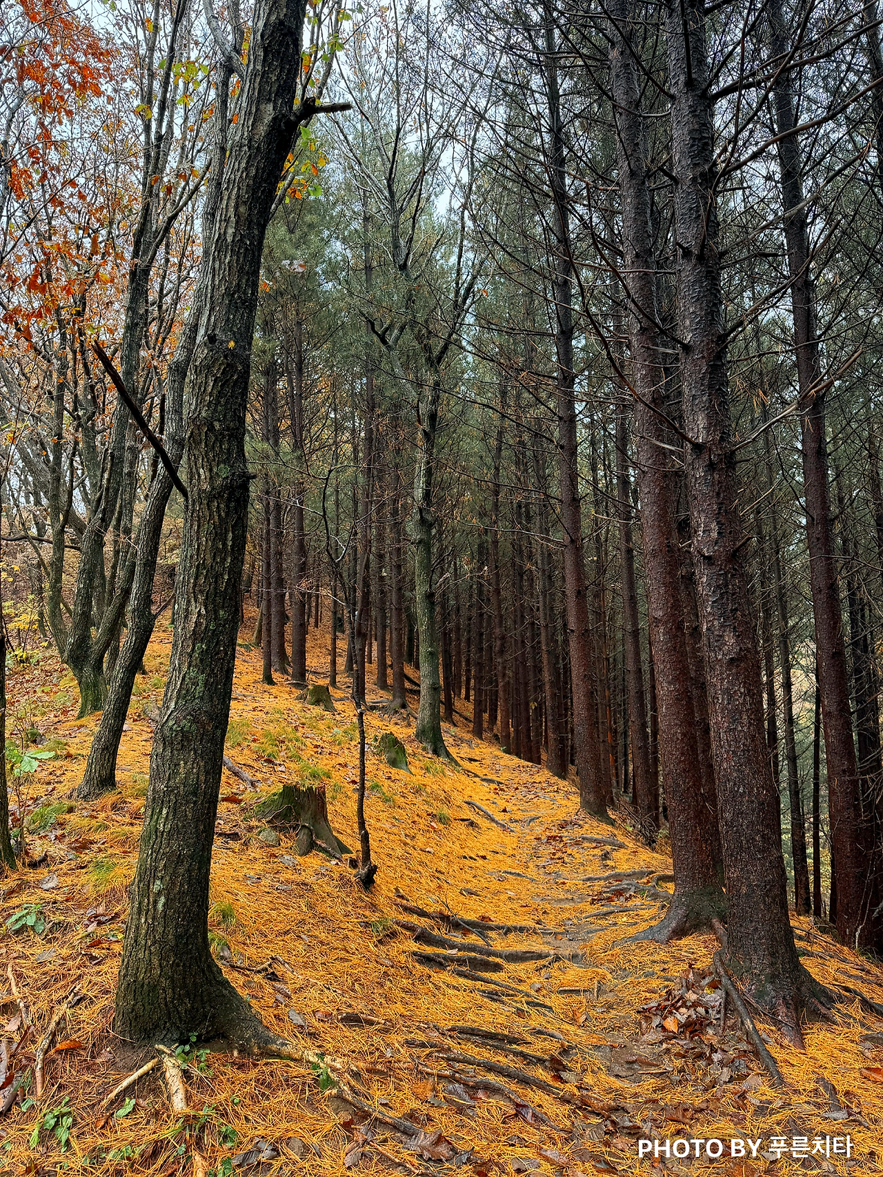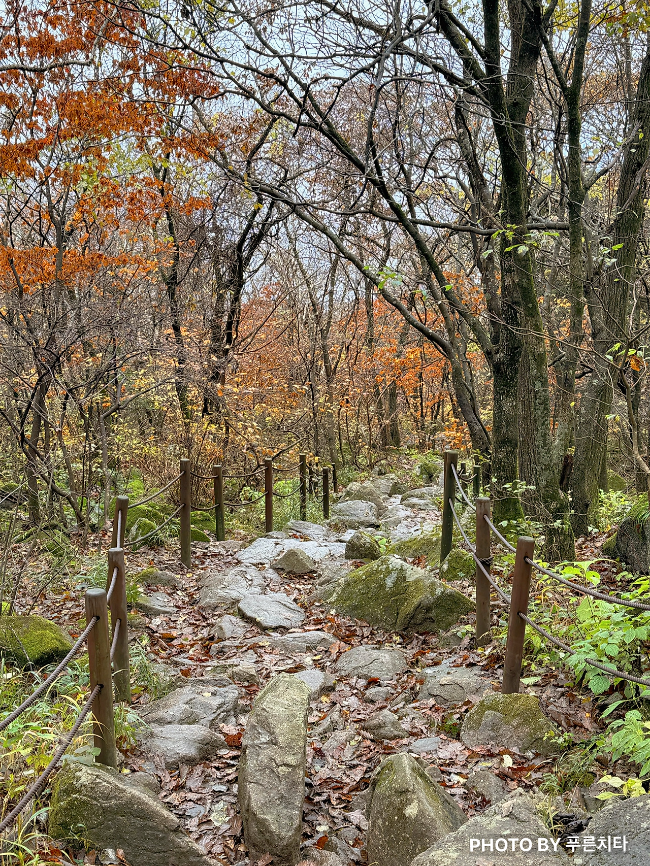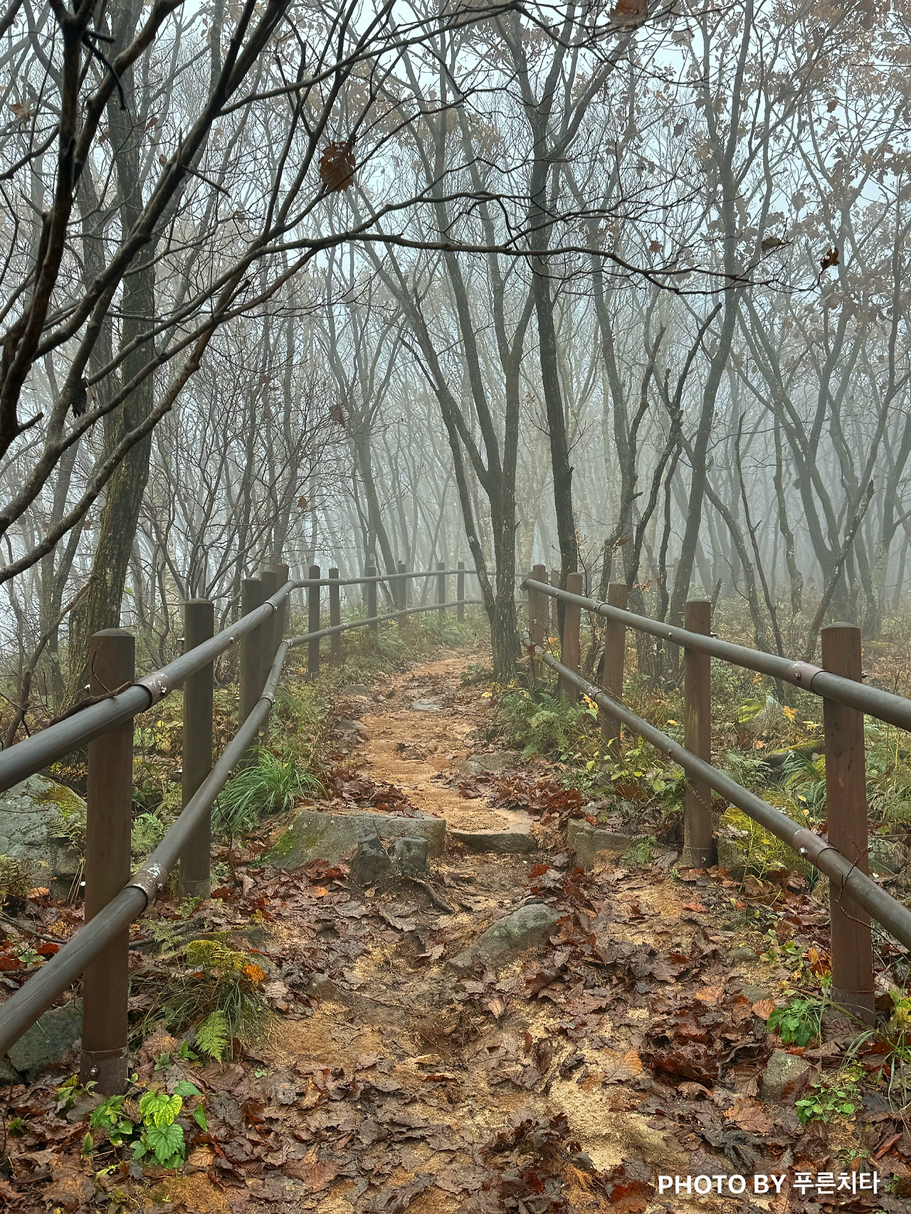 하산길은 완만하고 긴 코스였다. 평소라면 반기지 않았겠지만 이 날은 예외였다. 길이 미끄러웠고, 빗물이 등산로 일정 구간에선 얕은 계곡처럼 통째로 흐르기도 했기 때문이다.