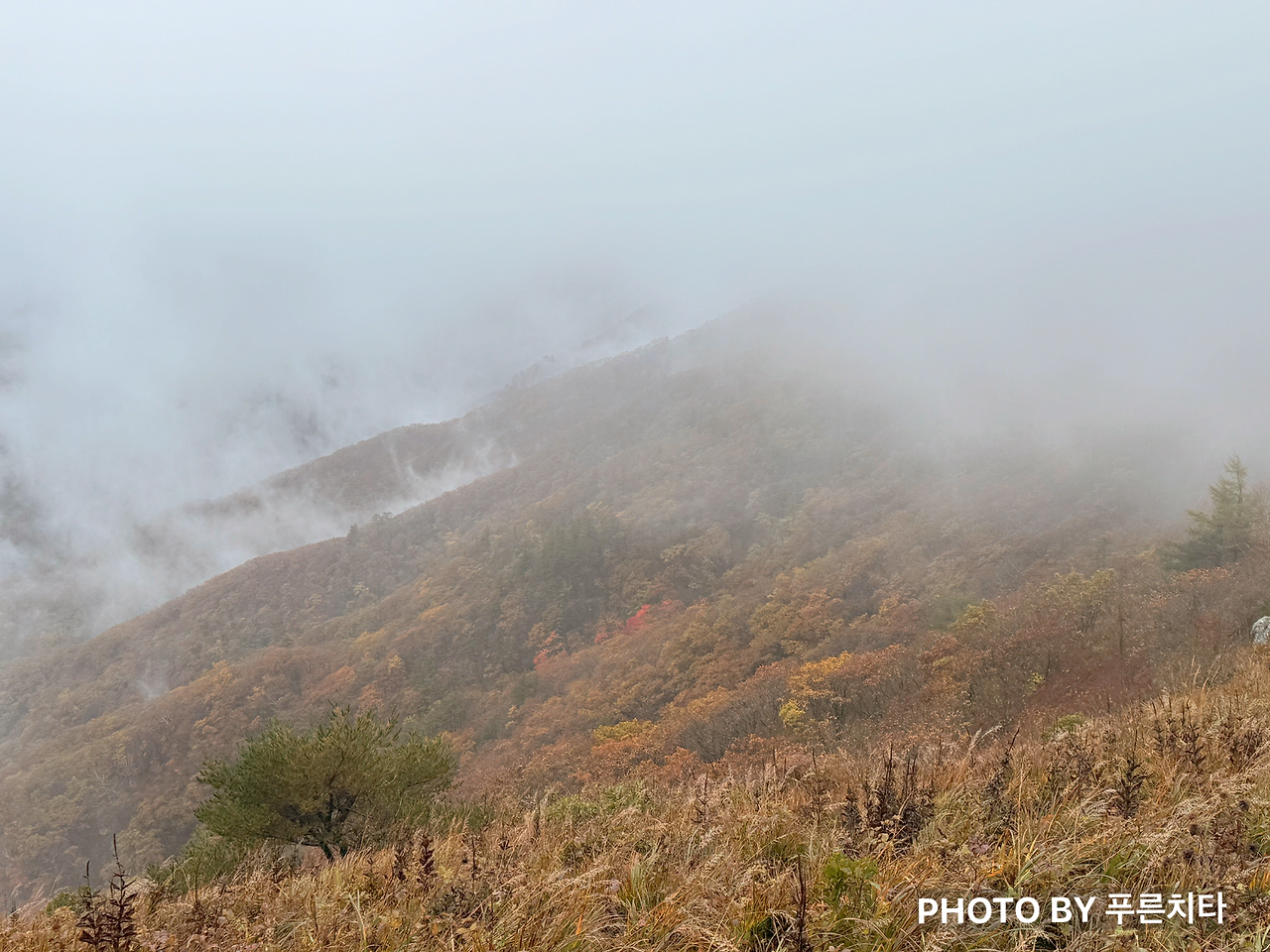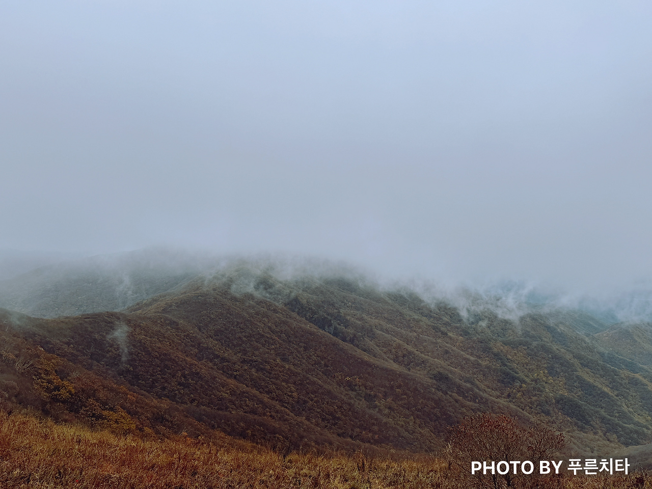 단양에 도착하니 역시 비가 내리고 있었다. 버스에 탈 때부터 어느 정도 체념한 상태였기에 일기예보대로 11시까지만 내리길 바라며 10시 반쯤 버스에서 하차했다. 안내버스 측에서 배포해 준 코스는 어의곡에서 비로봉, 천동으로 이어지는 길. 주차장으로 오후 5시 반까지 집결해야 했다. 이용자 리뷰엔 시간이 넉넉하다는 의견이 대다수였지만, 처음이라면 간당간당하다는 말도 있어 속도를 내어 올라갔다. 비 때문에 산 입구에서부터 안개가 있기에 정상에서 아무것도 안 보이겠구나 싶었지만, 만에 하나라는 게 있으니 일말의 기대를 가지고 발걸음을 옮겼다.