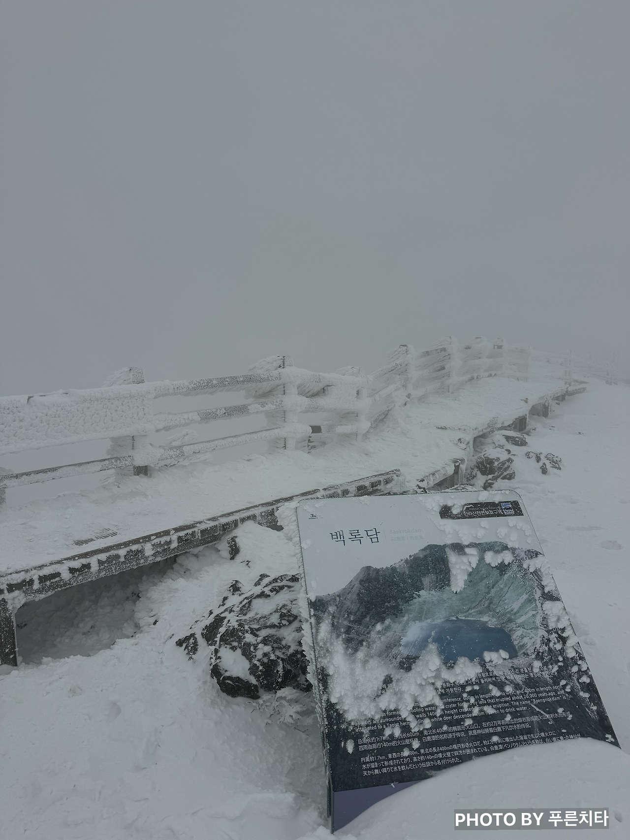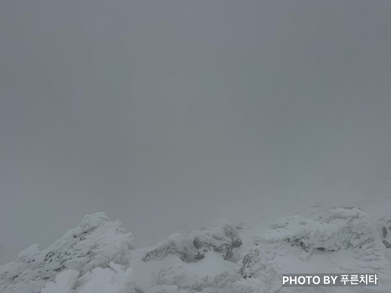 눈앞에 보이는 건 없지만 주변이 트이고, 바람이 거세졌다. 고지가 멀지 않았다는 게 본능적으로 느껴졌다. 그러나 오르고 올라도 또 오르는 길이 나왔다. 조금만 더 가면 될 줄 알았건만 끝나지 않으니 미칠 노릇이었다. 한 번씩 일찍 올라갔던 사람들이 눈에 몸을 반쯤 파묻힌 채로 내려오는 모습이 보일 때면 내려갈 걱정에 막막해졌다. 지쳐서 고개를 푹 숙인 채 올라가던 중, 내려가던 아저씨가 내게 “아가씨, 이 날씨에 관음사 방향에서 올라온 거예요? 대단하네. 정상까지 정말 얼마 안 남았어요, 힘내요.”라며 응원을 건넸다. 감사하다는 말을 간신히 하고 힘을 쥐어짜며 움직였는데, 정말 얼마 지나지 않아 백록담에 도착했다.