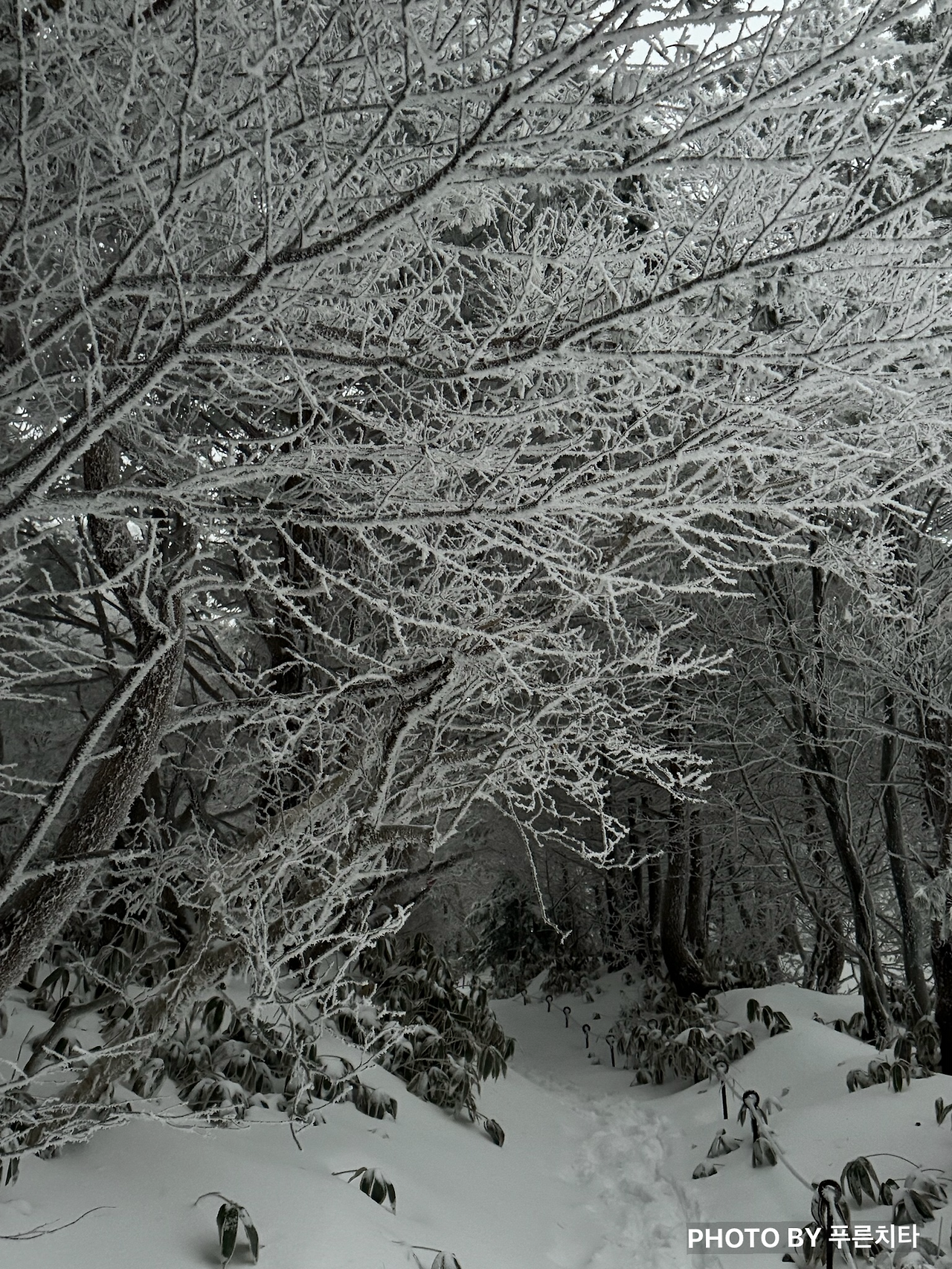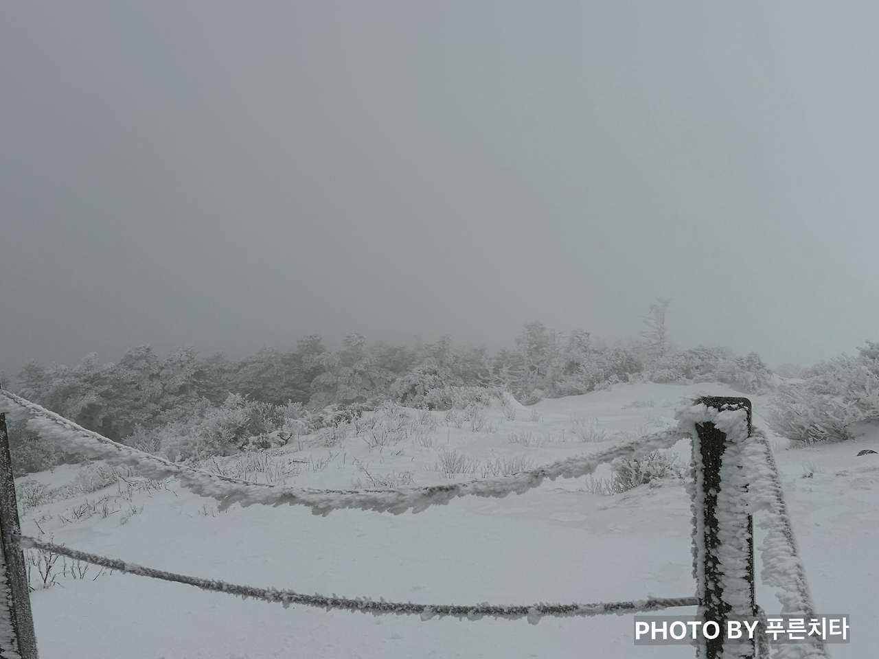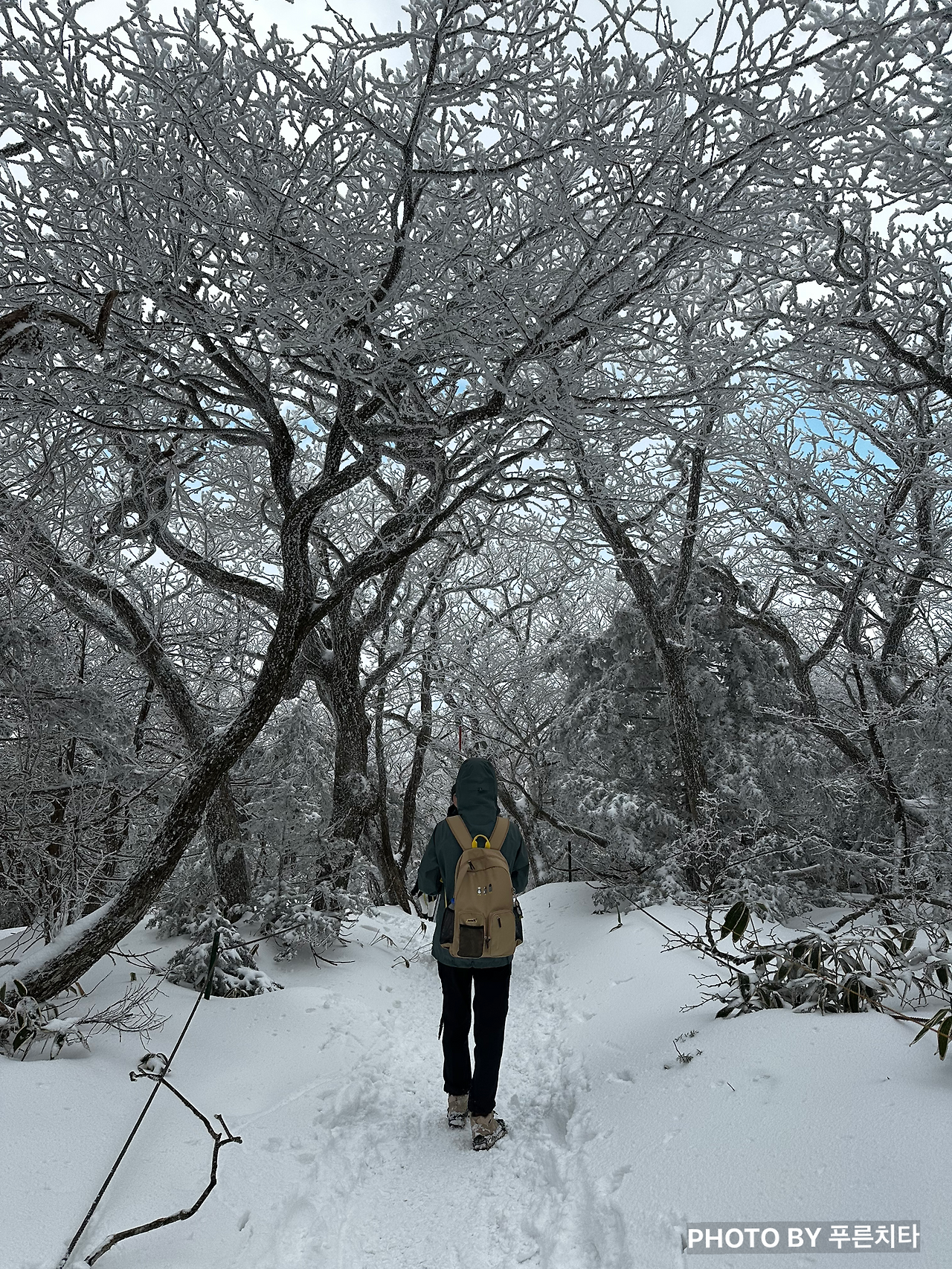 등산로 자체가 좁고, 옆은 바로 비탈길인 구간에선 주의가 필요했다. 눈이 너무 쌓인 나머지 밧줄을 친 높이보다 높은 상태였는데, 일부 구간은 허리까지 파묻힐 정도였다. 다행히 방수, 방풍이 되는 3L 재킷을 챙겨 입은 덕분에 상체는 전혀 젖지 않았다. 문제는 발이었다. 친구는 경남에 살다 보니 설산에 가는 일이 많지 않아 깜박해서, 나는 등산 장비를 잘 몰랐던 시기라서 둘 다 스패츠를 전혀 고려하지 않았던 것이다. 눈이 등산화로 조금씩 들어오면서 조금씩 젖어가는 발 때문에 더 추웠다. 나중엔 녹은 눈이 신발 안에서 찰랑거리는 게 느껴질 정도라 발에 어항을 달고 다니는 기분이었다.