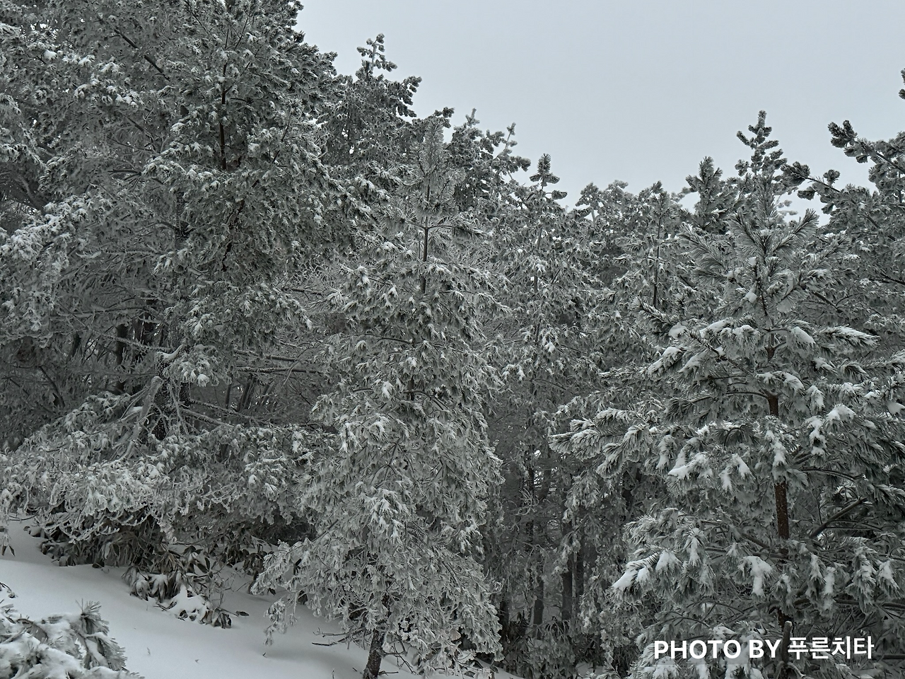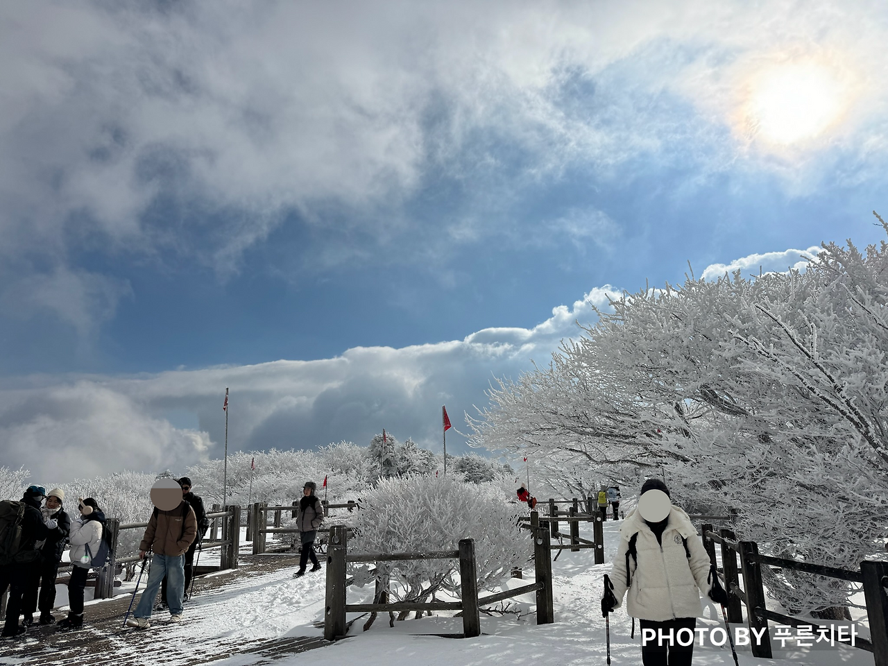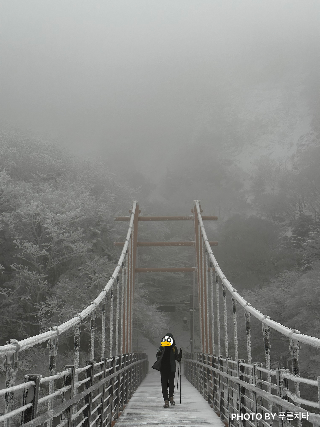 등산로 자체가 좁고, 옆은 바로 비탈길인 구간에선 주의가 필요했다. 눈이 너무 쌓인 나머지 밧줄을 친 높이보다 높은 상태였는데, 일부 구간은 허리까지 파묻힐 정도였다. 다행히 방수, 방풍이 되는 3L 재킷을 챙겨 입은 덕분에 상체는 전혀 젖지 않았다. 문제는 발이었다. 친구는 경남에 살다 보니 설산에 가는 일이 많지 않아 깜박해서, 나는 등산 장비를 잘 몰랐던 시기라서 둘 다 스패츠를 전혀 고려하지 않았던 것이다. 눈이 등산화로 조금씩 들어오면서 조금씩 젖어가는 발 때문에 더 추웠다. 나중엔 녹은 눈이 신발 안에서 찰랑거리는 게 느껴질 정도라 발에 어항을 달고 다니는 기분이었다.