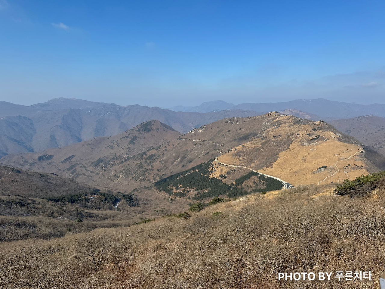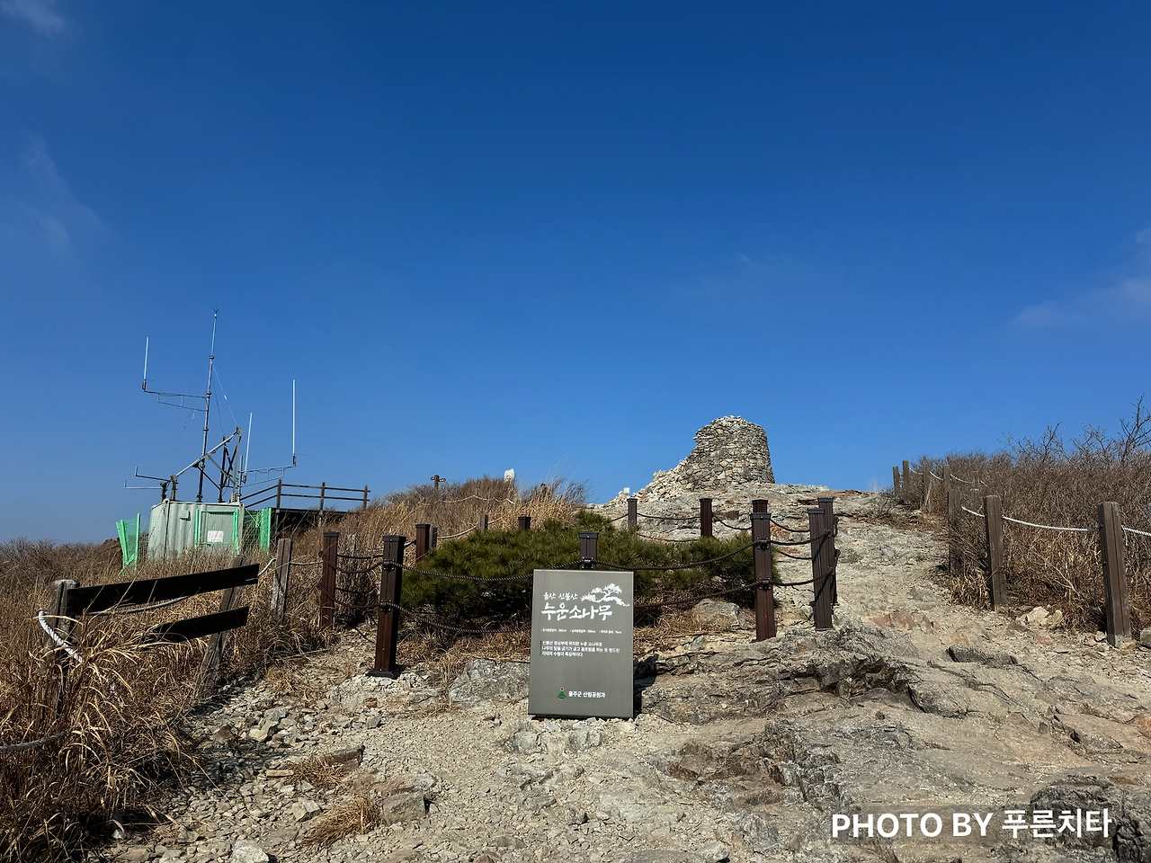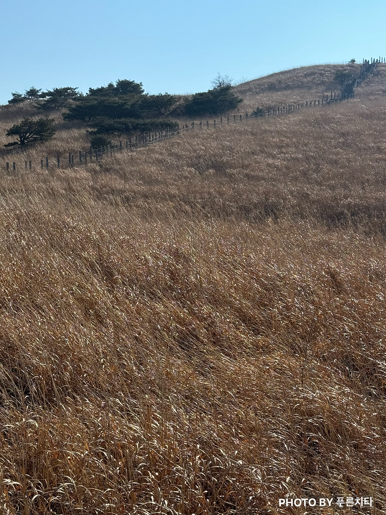한라산에서와 마찬가지로 친구는 순식간에 내 시야에서 사라졌다. 함께 도전하지만 따로 올라가는 상황이라 혼자 다닐 때와 크게 다를 건 없었다. 무리하며 따라잡지 않고 페이스 유지하며 꾸준히 올라가니 억새 있는 구간이 나왔다. 억새철이 지나서 시들어 있었지만 햇볕을 받아 금빛으로 반짝이며 바람에 흩날리는 모습은 아름다웠다.