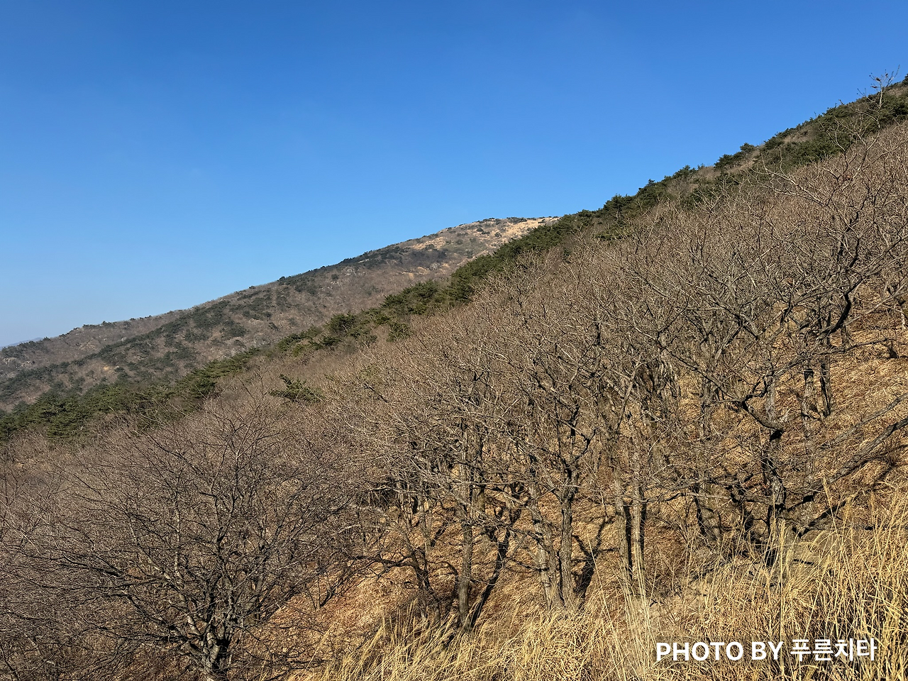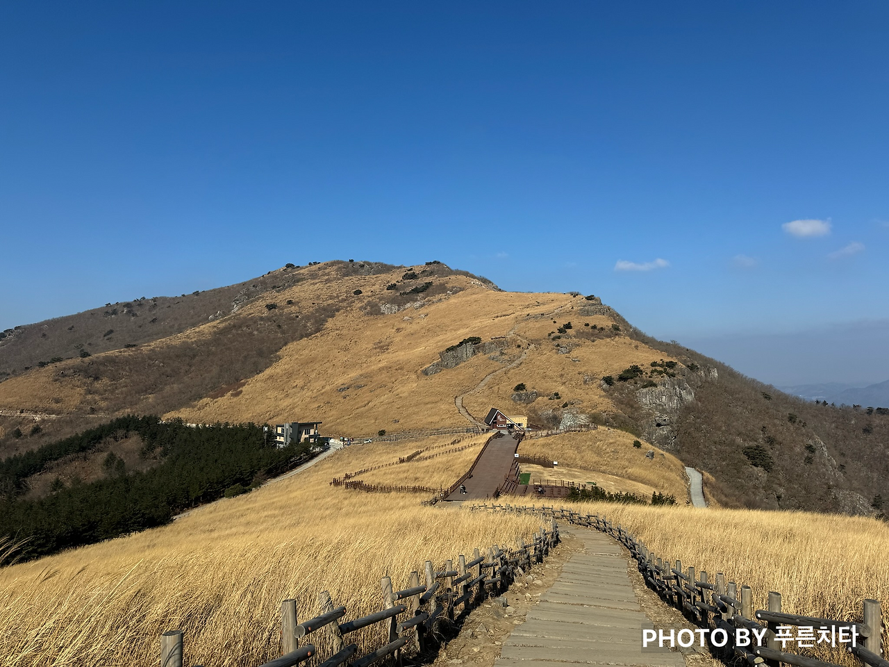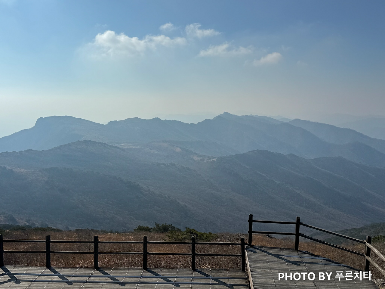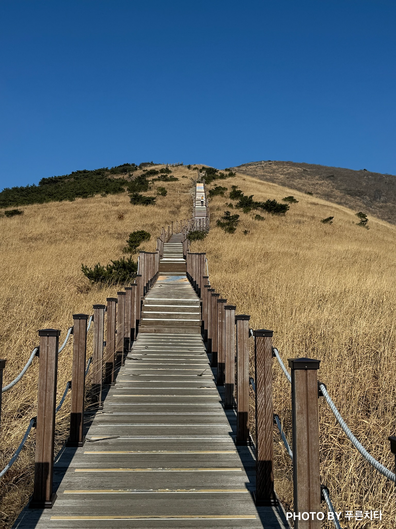 한라산에서와 마찬가지로 친구는 순식간에 내 시야에서 사라졌다. 함께 도전하지만 따로 올라가는 상황이라 혼자 다닐 때와 크게 다를 건 없었다. 무리하며 따라잡지 않고 페이스 유지하며 꾸준히 올라가니 억새 있는 구간이 나왔다. 억새철이 지나서 시들어 있었지만 햇볕을 받아 금빛으로 반짝이며 바람에 흩날리는 모습은 아름다웠다.