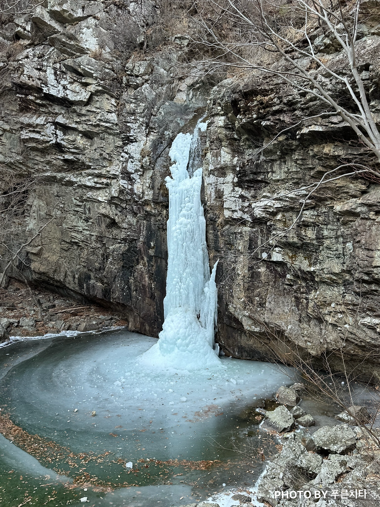 주차장 근처에 다다르니 계곡물이 얼어있는 게 보였다. 해발고도는 낮아도 햇볕이 잘 들지 않는 지역이라서 그런 듯했다. 폭포에 얼음이 꽤 멋있어서 사진을 남겼다.