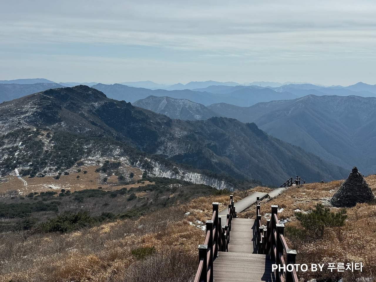 케이블카에서 내려 천황산까지 가는 길은 경치도 좋고, 경사가 완만해서 관광 목적으로 가기에도 좋아 보였다. 다만 눈이 얼어붙은 구간이 꽤 있어서 아이젠은 필수였다. 3월까지는 등산할 때 아이젠을 필수로 챙겨야 하지만 관광 목적으로 온 사람들은 전혀 생각하지 못했을 것이다. 아이젠이 없어서 등산로 울타리를 잡으며 애먹고 있는 사람들을 지나쳐 성큼성큼 걸어갔다.