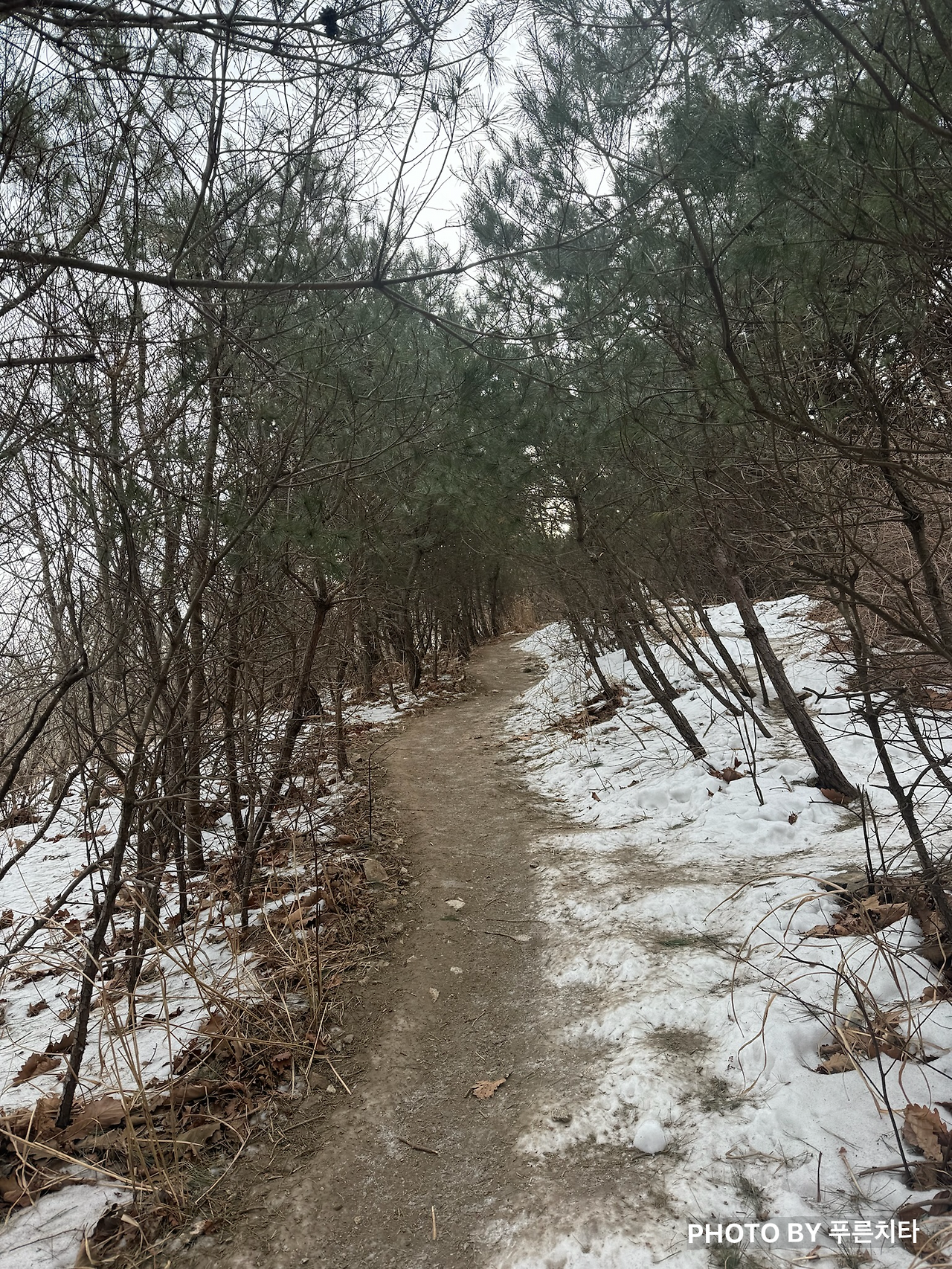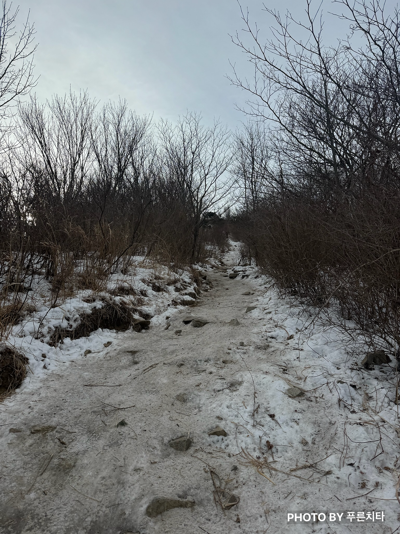 고헌산에서 사람들이 가장 많이 이용하는 코스는 와항재에서 정상까지 가는 최단코스이다. 하산 후 천황산도 가야 하기 때문에 우리는 주저 없이 와항재로 향했다. 보통 정상으로 올라가는 길이라고 해도 계속 오르막길만 있는 게 아니다. 능선 따라 내리막길이나 평지가 나오는 구간이 나오기도 하는데 고헌산은 초반부터 경사가 좀 있고, 거의 오르막길 위주였다. 산 밑부분은 눈이 없었지만 올라가면서 조금씩 땅이 얼어있는 게 보여 중간에 아이젠을 꺼냈다. 경사길에 서서 끼다가 불편해서 옆에 보이는 조금 평평한 곳으로 이동하려던 중에 얼음에 미끄러져 넘어졌다. 다행히 구르진 않고 엉덩방아에 그쳤지만 옷에 진흙과 먼지가 꽤나 묻었다. 잘 털어지지 않아서 친구 차를 탈 때 민폐가 될까 봐 걱정이었으나, 다행히 친구가 시트 보호를 위한 돗자리를 챙겨 왔다고 해서 안심했다.