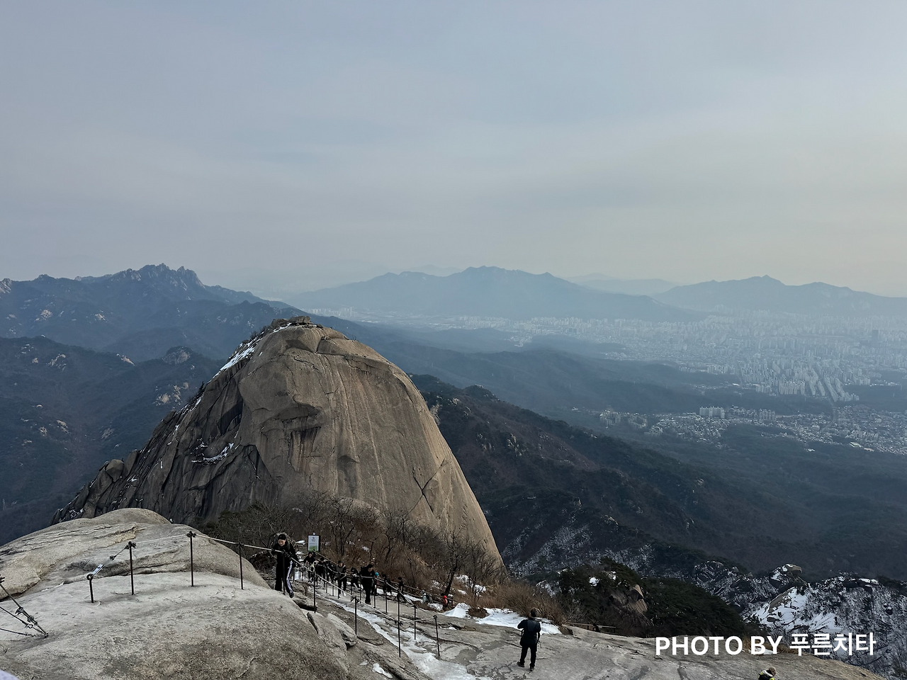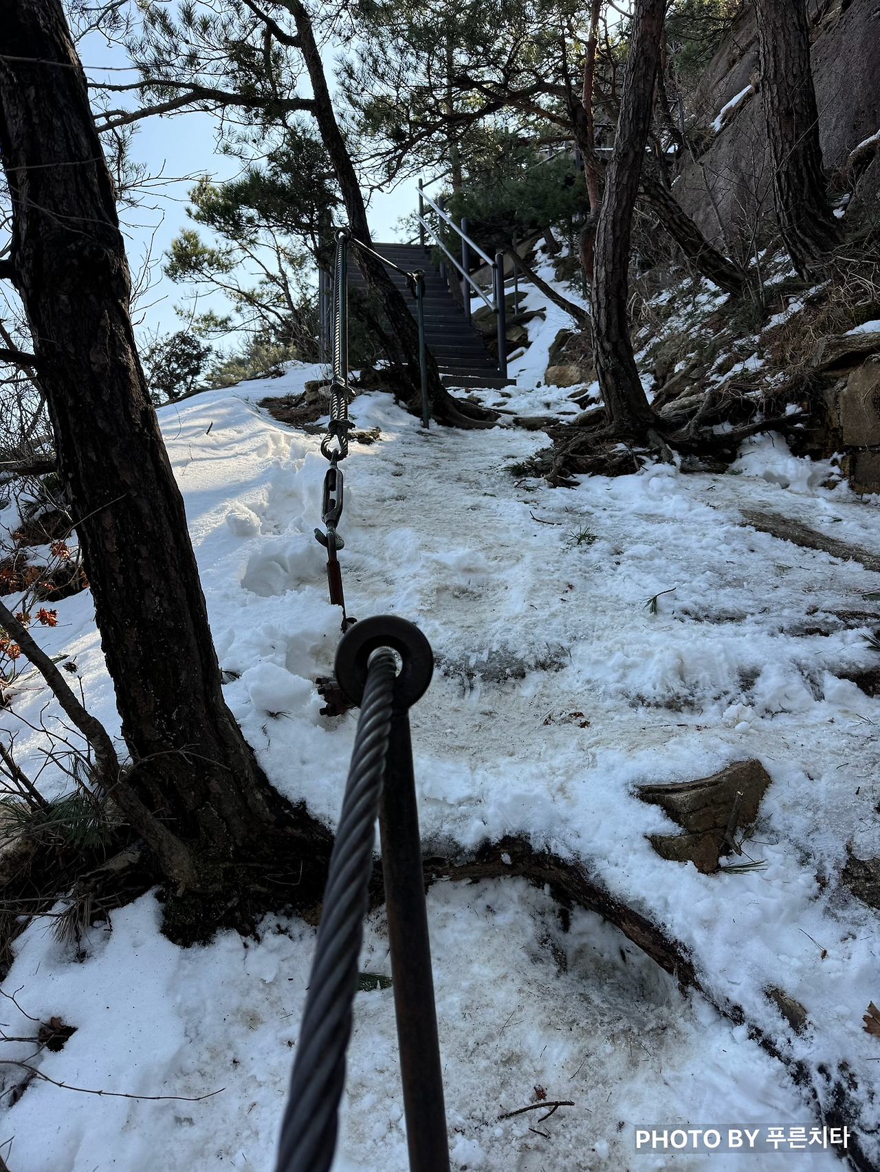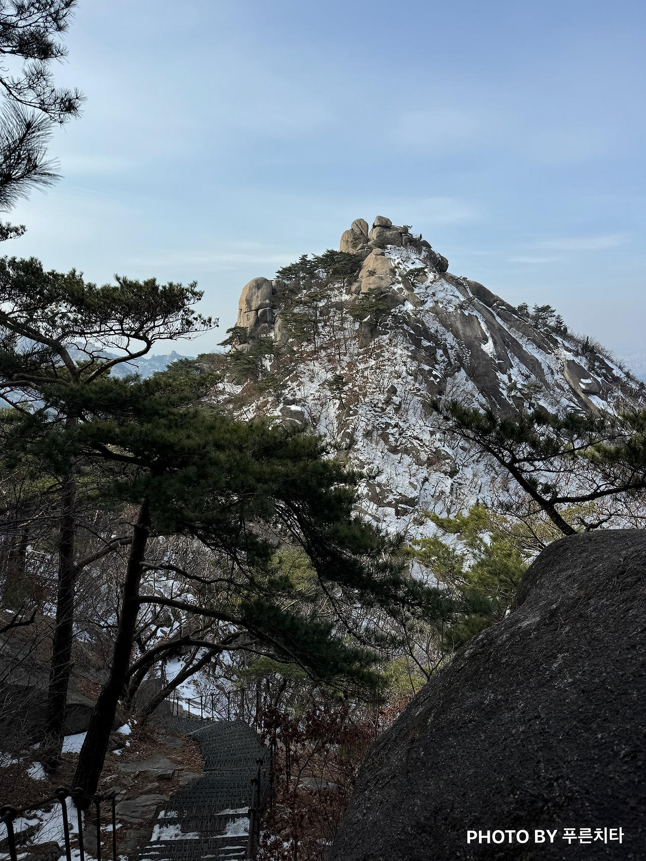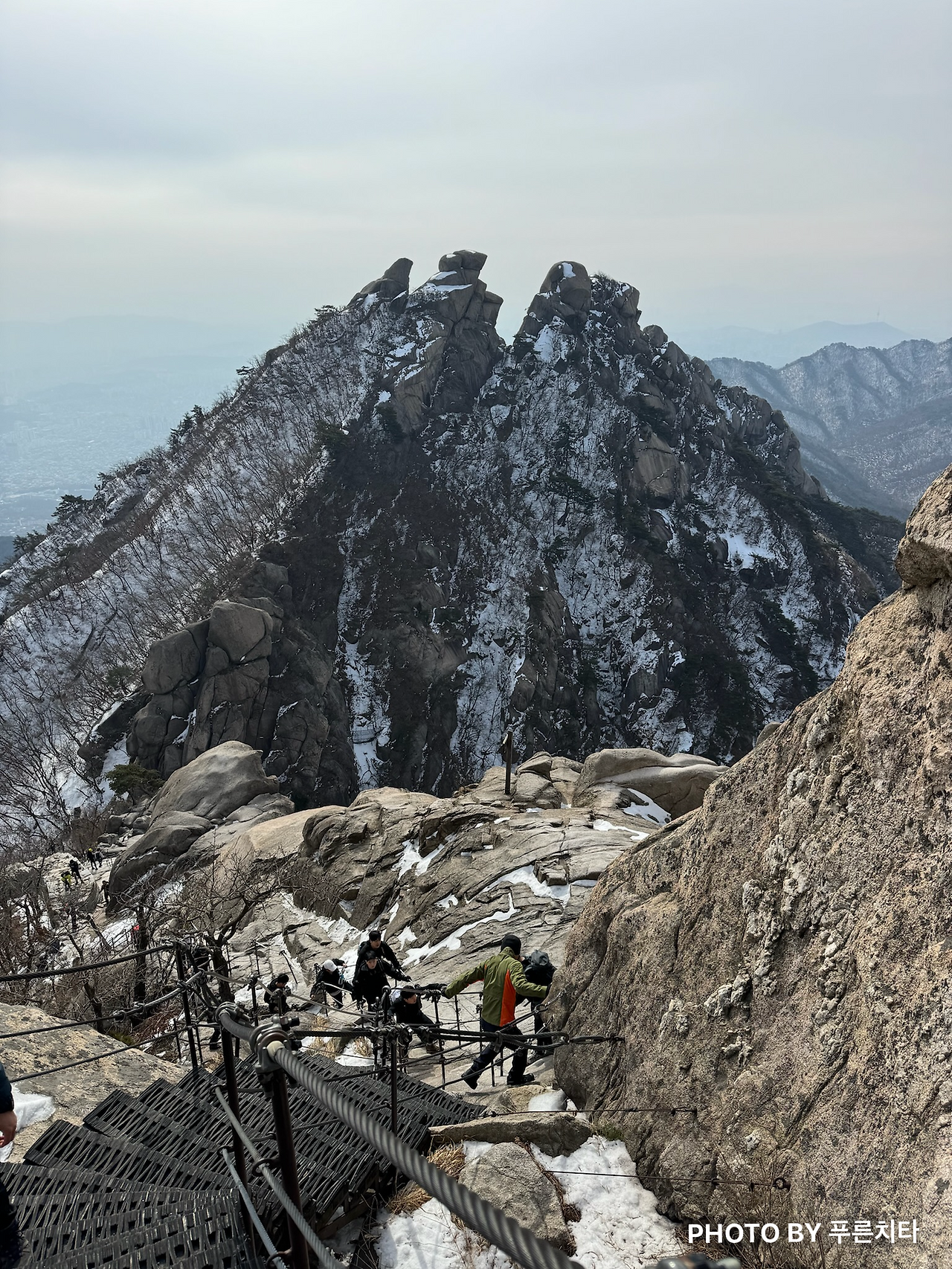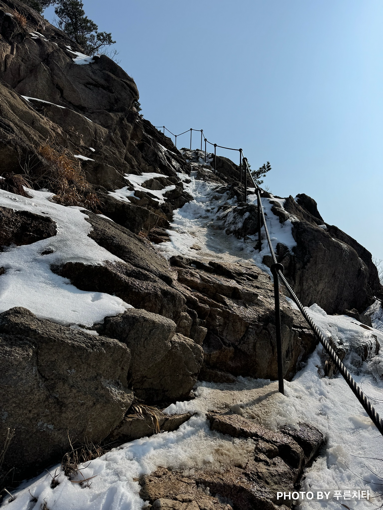 아이젠을 착용한 채로 난간을 붙잡으며 바위를 올랐다. 얼음이 일부만 군데군데 얼어 있는 상태였는데 점점 얼음이 없는 곳이 많아지자 발이 불편했다. 길이 좁은데 뒤따라 올라오는 사람은 많았고, 옆으로 빠질 공간이 없었다. 아이젠을 빼기 위해 중간에 멈춰 길을 막을 수는 없기에 그냥 가려고 했는데 내 상황을 뒤에 계시던 아저씨가 알아차린 듯했다. 그분은 내게 “얼음이 많지 않은 바윗길에선 아이젠 착용 안 하는 게 좋아요. 착용하고 가면 무릎에 무리가 많이 가요.”라고 하셨다. 빼고 싶은데 비킬 공간이 없어서 그냥 그랬다고 답했더니 “기다려줄 테니 천천히 하세요”라며 배려해 주셨다. 산에서는 일행이 아니니 모른 체할 수도 있는데도 친절하게 알려주고, 챙겨주는 사람들이 많다. 자연의 경이로움, 멋진 주변 경관을 보는 것도 좋지만 사람의 따스한 온정을 느낄 수 있는 것도 등산의 매력이다.