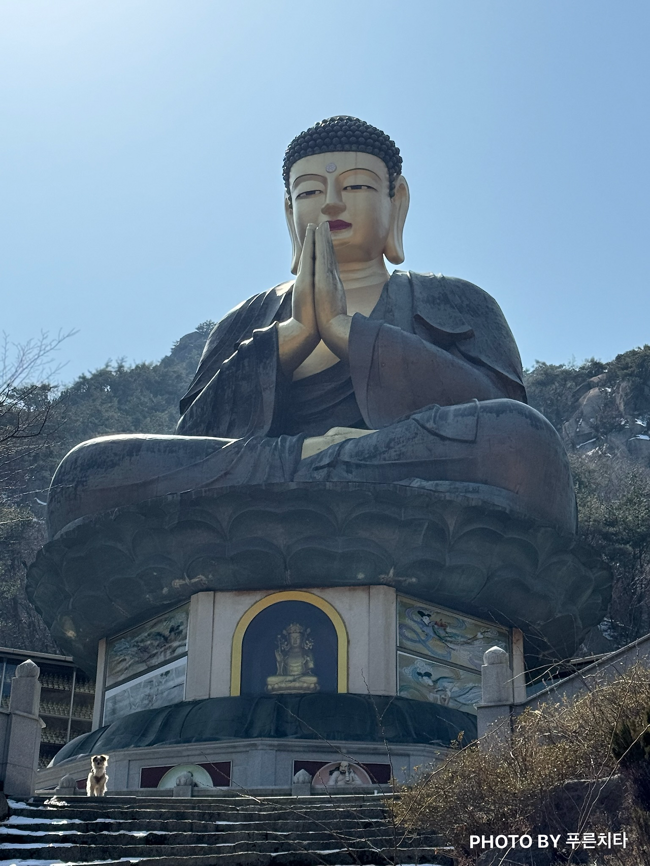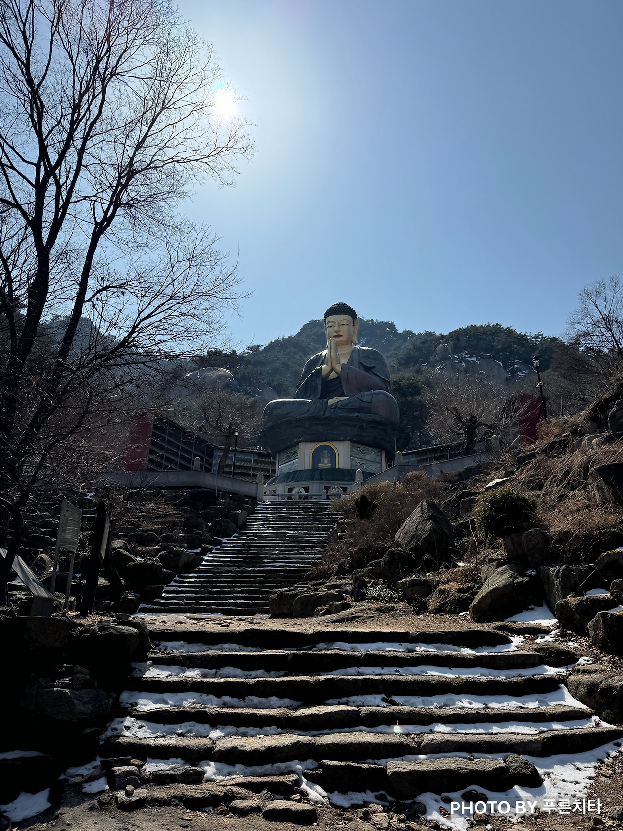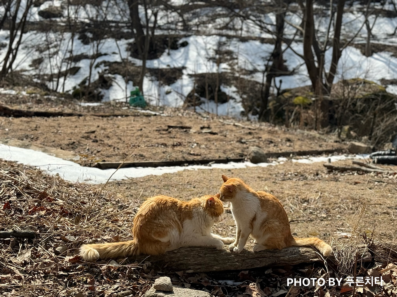 오르락내리락 반복하다가 잠깐 나온 평탄한 구간이 나왔다. 햇볕이 잘 드는 곳에 고양이 두 마리가 아웅다웅하는 모습을 보고 좋아했는데 평화로움은 잠시뿐. 얼마 안 가서 또 계단길을 올라가야 했다. ‘국녕사’라는 절을 지나쳐서 가는데 야외에 있는 불상이 정말 거대했다.