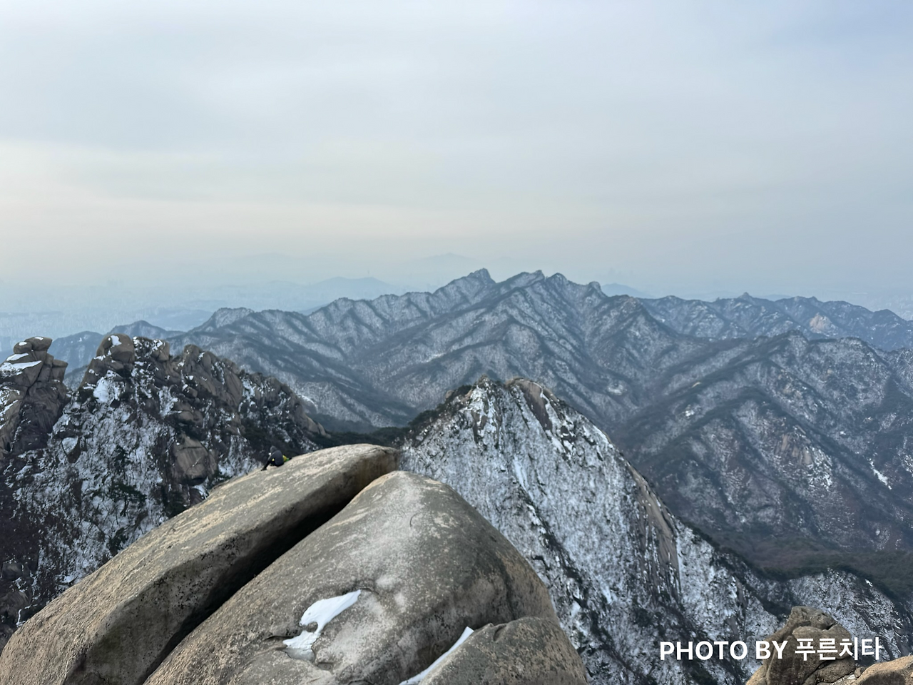 영봉에서 백운대로 향하는 길엔 얼음이 조금 낀 정도가 아니라 길이 통으로 얼어있는 구간이 나왔다. 아이젠을 착용하고 가는데 내 앞엔 아이젠을 가져오지 않은 사람들, 나처럼 등산로와 눈치싸움 하는지 있어도 안 끼는 사람들이 우르르 있었다. 그 좁은 얼음길을, 아이젠 없이 조심히 가겠다고 길을 막고 느리게 가고 있으니 속이 터졌다. 저러다가 누구 하나 넘어지면 도미노처럼 다 넘어져서 위험하니 뒤에 있고 싶지 않았기에 “잠시만요”를 외치며 제치고 올라갔다.