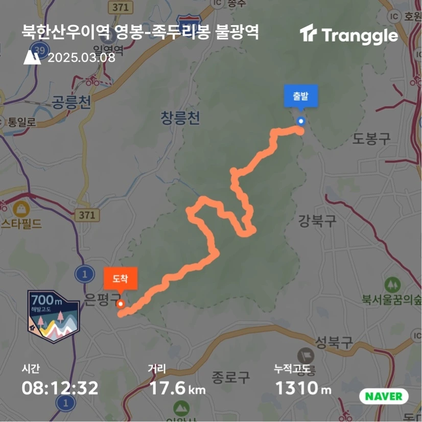 이번 목표는 북한산 횡종주 완주하기. 북한산우이역에서 출발해서 영봉, 백운대(정상)을 거쳐 문수봉, 비봉 등을 지나 족두리봉을 마지막으로 하여 불광역으로 내려오는 코스로 등산로 입구 기준으로만 하면 약 16km 정도 된다. 24년 가을에 이 코스를 도전했는데 비봉에서 족두리봉 가는 길을 못 찾고 헤맸고, 체력적으로도 힘들어서 결국 다른 길로 내려가서 마무리했다(12편 참고). 날이 따뜻해지면 재도전할 생각이었으나 이 날 충동적으로 실행에 옮겼다.