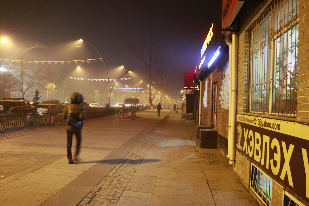몽골의 수도인 울란바타르의 겨울은 대기오염이 심각했다. 아래 사진은 시내 거리인데 연무로 가득하다.