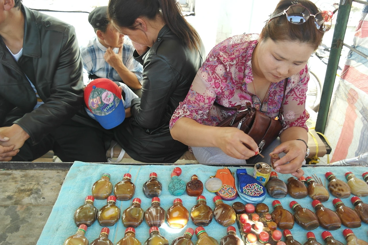 몽골 시장에서 파는 좋은 냄새가 나는 향수인 것 같았는데 시장에 같이 다닌 친구가 설명해 준다 코담배라고 사용법은 사진의 판매원이 하고 있는 것처럼 뚜껑을 열면 귀이개 같은 것이 따라 나온다. 안에 들어 있는 가루를 귀이개로 조금 덜어내어 손등에 올려놓고 흡입하는 방식으로 사용한다고 한다. 친한 친구들 간에는 코댐배를 오른손으로 건네고 상대방이 받아서 조금 덜어 내어 흡입하고 돌려주는 풍습이 있다고 한다. 나도 각기 다른 맛이 나는 코담배 두 개를 사서 몇 번 시도해보았는데 그리 자주해볼일은 아닌 것 같다. 중독성이 있는 담배라기보다는 그냥 몽골에서 해보면 재미있을 것 같은 추억거리로 담아 왔다.