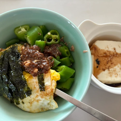 이건 한식을 먹고 싶지만 반찬을 여러 개 먹고 싶지는 않고 설거지가 너무 많아지는 것이 싫을 때 먹는 비빔밥 조합이다. 특히 여름에 정말 좋은데 불을 많이 안 써도 되니 가스레인지 앞에 있는 시간도 줄어들고, 가벼운 한 끼를 먹고 싶을 때 자주 찾아 먹는다. 밥을 밑에 깔고 오이고추를 가위로 대충 자르고 된장+들기름+땅콩버터 조합의 소스를 넣은 후 김가루와 달걀프라이를 올렸다. 부족할 수도 있는 단백질은 간장 참기름 연두부로 보충했다.