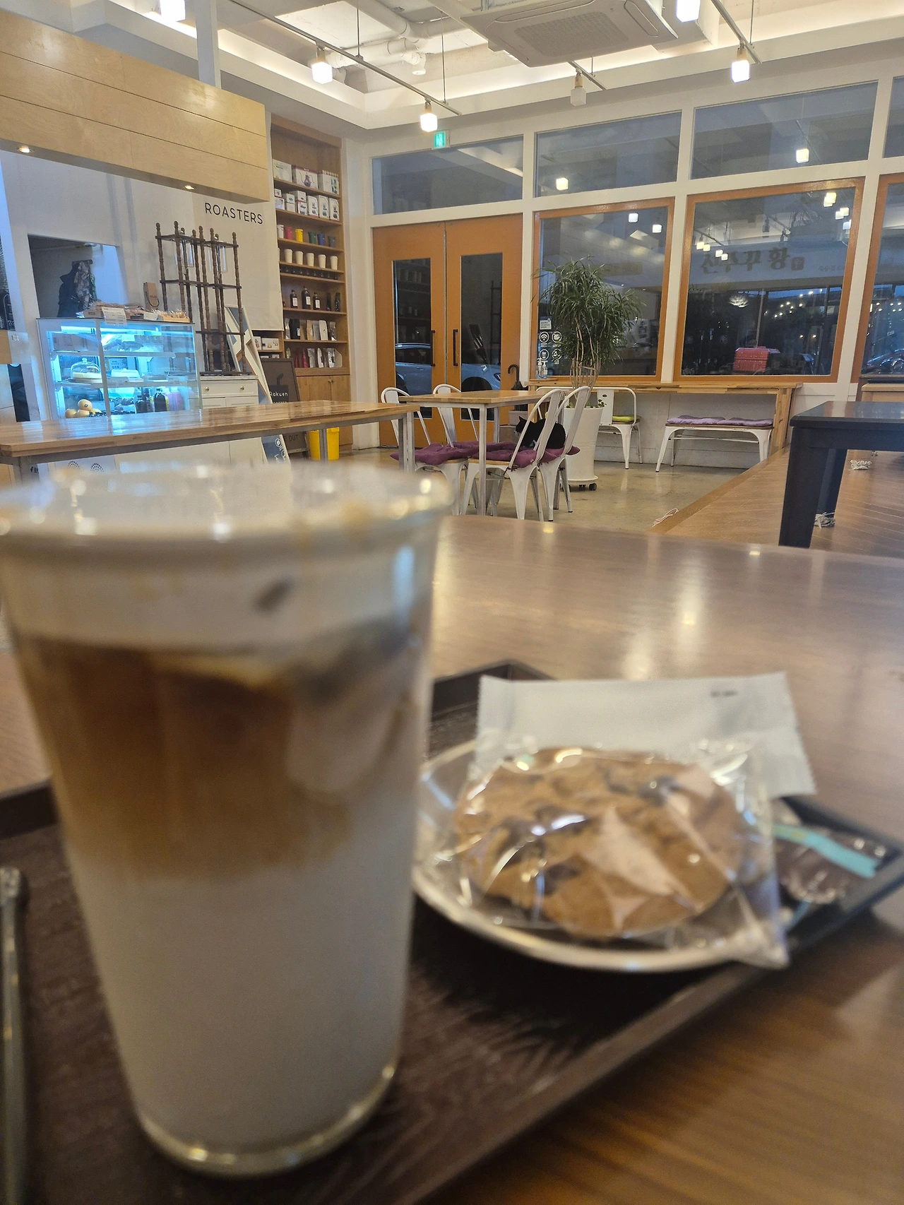 먹물 식빵과 치즈 식빵이 서로 엉겨 붙어 놀고, 맛있었던 흑임자 라테, 달달한 초콜릿 쿠키, 서비스 초콜릿 한알, 친절한 주인분까지 오늘의 내 행운들이었다.