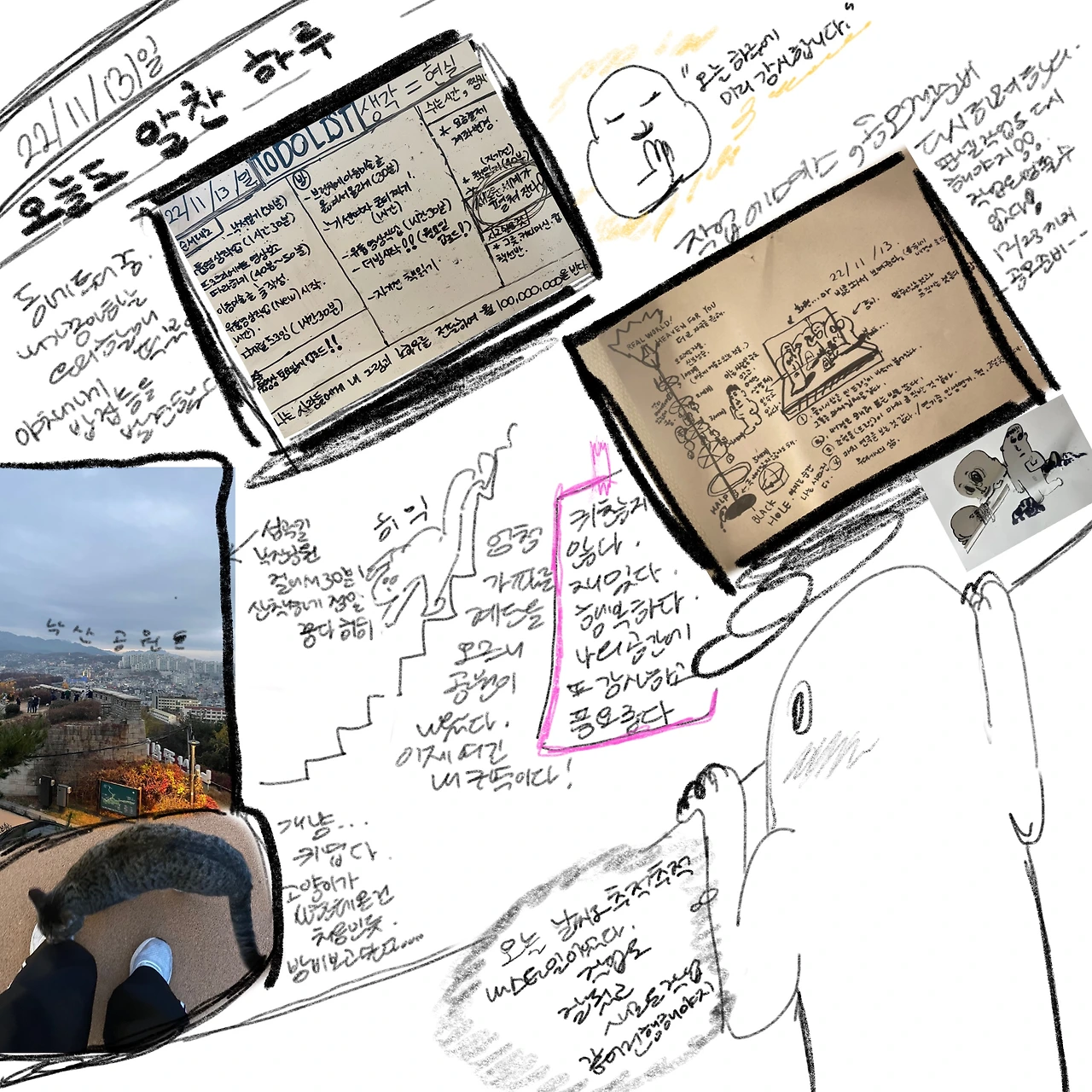 일어나자마자 목표 한 문장 100번쓰기를 하고 빨래를 했다. 요리는 못하지만 굴소스를 넣어서 아주 맛있는 볶음밥을 해 먹고 작업을 계속했다. 반짝이는 영감을 받은 날이라 그런지 에스키스도 많이 하고 종이로 조물조물 만들기도 했다. 영상 작업은 시간이 오래 걸려 몸이 찌뿌둥할 때쯤 낙산공원으로 산책을 갔다. 우리 집에서 한 30분 정도 걸린다. 산책을 좋아하는 나는 해가 지기 직전의 아주 포근한 낙산공원의 공기를 맡았다. 덤으로 길냥이에게 간택당해 털을 만져봤다. (처음이라 떨렸음)