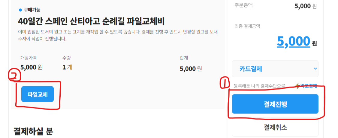 먼저 [나의 서재]에 들어가면 내가 출간한 책이 보이는데 책표지나 제목을 클릭한다. 화면에 보이는 [등록 정보] - [파일교체]를 클릭한다. 결제 진행 창이 뜨고 5000원 수수료를 결제하면 파일을 교체할 수 있다. 매달 둘째 넷째 금요일이 파일교체 마감일이라고 하니 날짜를 맞춰야 한다.