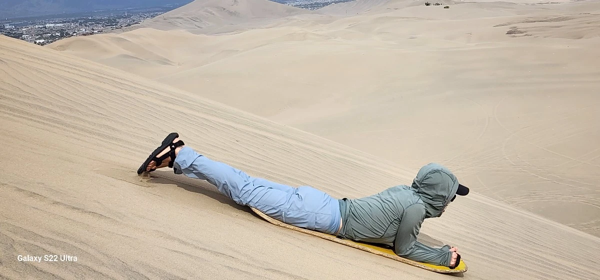 언덕 위 줄 서 있던 사륜구동차를 탔다. 모래 언덕 꼭대기에서 아래로 곤두박질쳤다가 다시 위로 내달렸다. 심장이 쪼그라드는 것 같으면서도 신났다. 마구 소리를 질러대니 스트레스가 사막 모래 속으로 빠져나가는 듯했다. 이어 차에서 내려 보드 위에 엎드려 모래 언덕을 내려왔다. 샌드보딩도 재밌고 짜릿했다. 이카 사막에서 나는 내 나이를 잊었다.