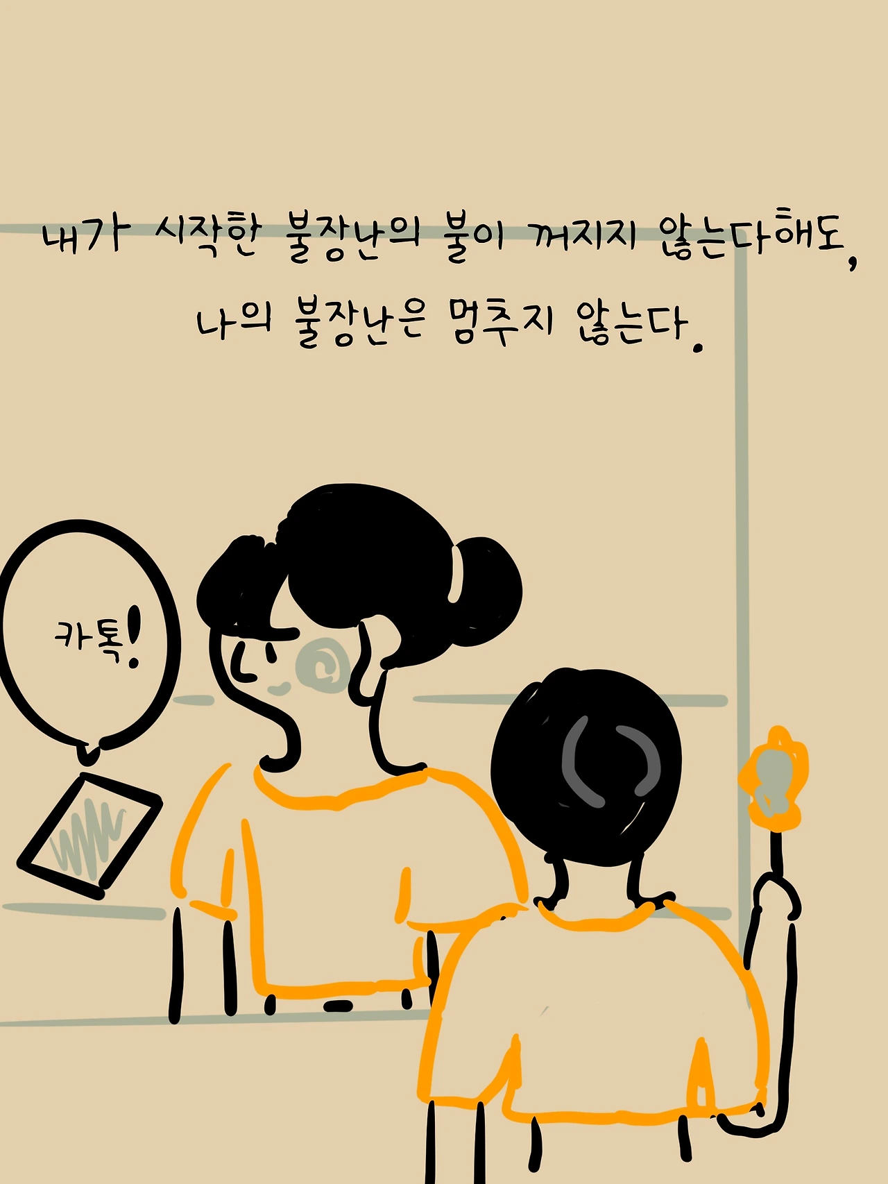어쩌면 시작부터 잘못되었을지도 몰라. 위험할 수도 있다는 것을 알면서도, 잘 살피지 않고 시작했어. 나의 불장난은 거기서 시작해, 불길이 완전히 나를 뒤덮을 때까지 나를 성장하게 해 주었단다. 화상을 입었을지도 모르지만, 그것은 사람들과의 인연을 더 돈독하게 만들어주었고, 오히려 서로 알아갈 수 있게 도와주었다. 불이 활활 타올라서 어쩌면 악연으로 바뀔지도 모르지만, 자주 불길이 퍼질수록 그 사람과의 관계는 더욱 두터워지는 것이다. 내가 시작한 불장난의 불이 꺼지지 않는다 해도, 나는 불장난을 멈추지 않을 것이다.