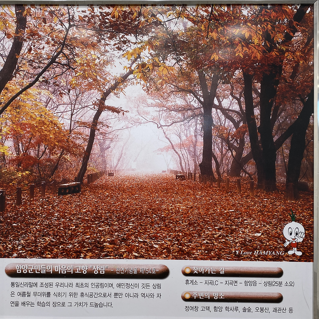 처음 함양휴게소에 갔을 때 화장실 입구에서 레드카펫처럼 빨간 낙엽이 깔린 사진을 보았다. 황홀한 풍광만으로도 입이 떡 벌어지지만, 그 아래의 설명에 더 압도된다. 이 숲은 신라시대 말기의 유학자 고운 최치원이 범람하는 물을 다스리기 위해 만든 우리나라 최초의 인공숲인 상림이다.