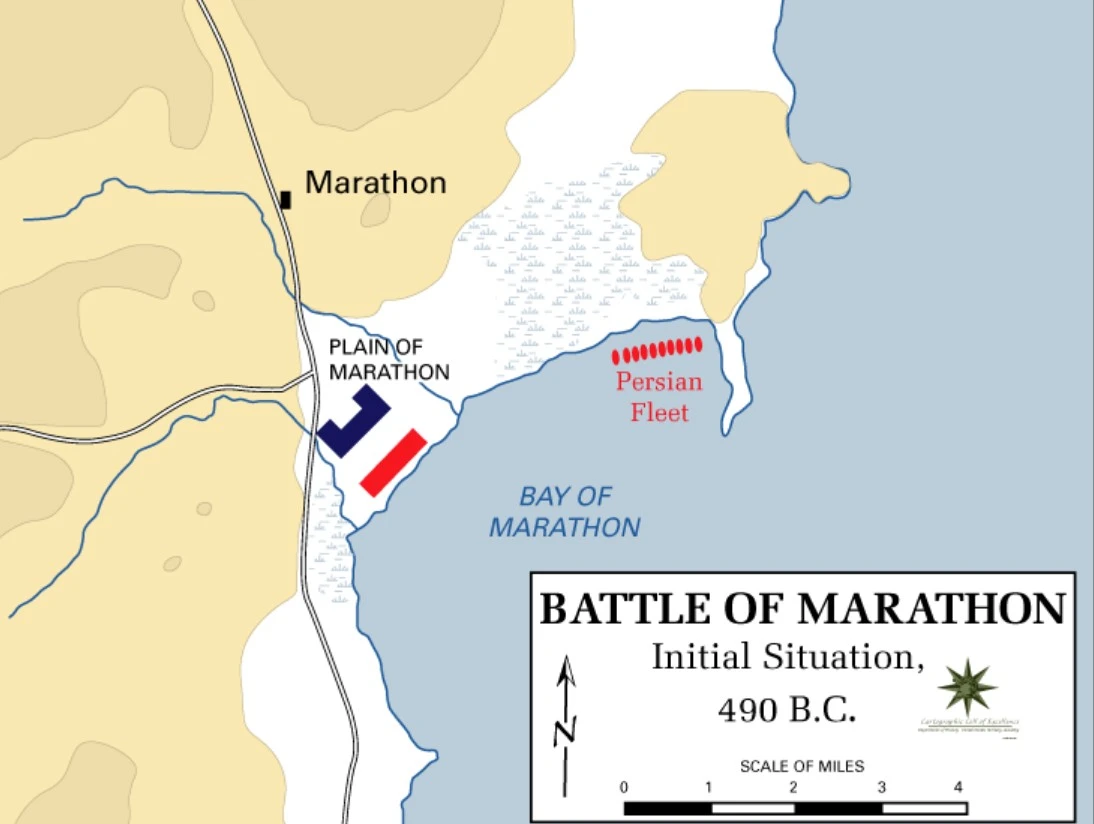마라톤은 그리스 역사에서 가장 중요한 곳이다. 페르시아의 다리우스 황제는, 이오니아 편을 들어 페르시아에 적대적인 행동을 한 아테네와 스파르테를 굴복시키려 했다. 그래서 1만 정예부대를 보내 마라톤에 상륙시켰으나 아테네의 강렬한 저항으로 패배했다. 페르시아군은 다시 배를 타고 바로 아테네로 향했지만, 아테네군이 42.195km를 달려 도시로 돌아와 전투를 준비하고 있어서 결국 철군했다. 이것이 기원전 490년에 벌어진 두 번째 페르시아 전쟁이다. (기원전 492년의 첫 번째 침략은 배가 풍랑을 만나 실패했다) 근대올림픽 창시자 쿠베르탱은 이러한 일화에 환상적인 장치를 넣어 한 명의 병사가 달려와 승전을 알리고 죽어 그 병사를 기리기 위해 마라톤이라는 장거리 경주를 만들었다. 하지만, 실제 전쟁에서는 아테네군 전체가 아테네로 돌아와 아테네를 사수했다. 지금 마라톤은 아름다운 해변이 있어서 과거의 전쟁은 느껴지지 않는다. 전투가 벌어졌던 마라톤 들판에는 지금 그때 죽은 아테네와 플라타이아이의 전사자 무덤 두 개가 있다. 황량한 벌판에 군데군데 오래된 올리브 나무가 심겨 있다. 이천오백 년 전의 함성을 들어보려 귀를 기울였지만, 영혼들이 잠들어 있어 바람 소리조차 침묵했다.