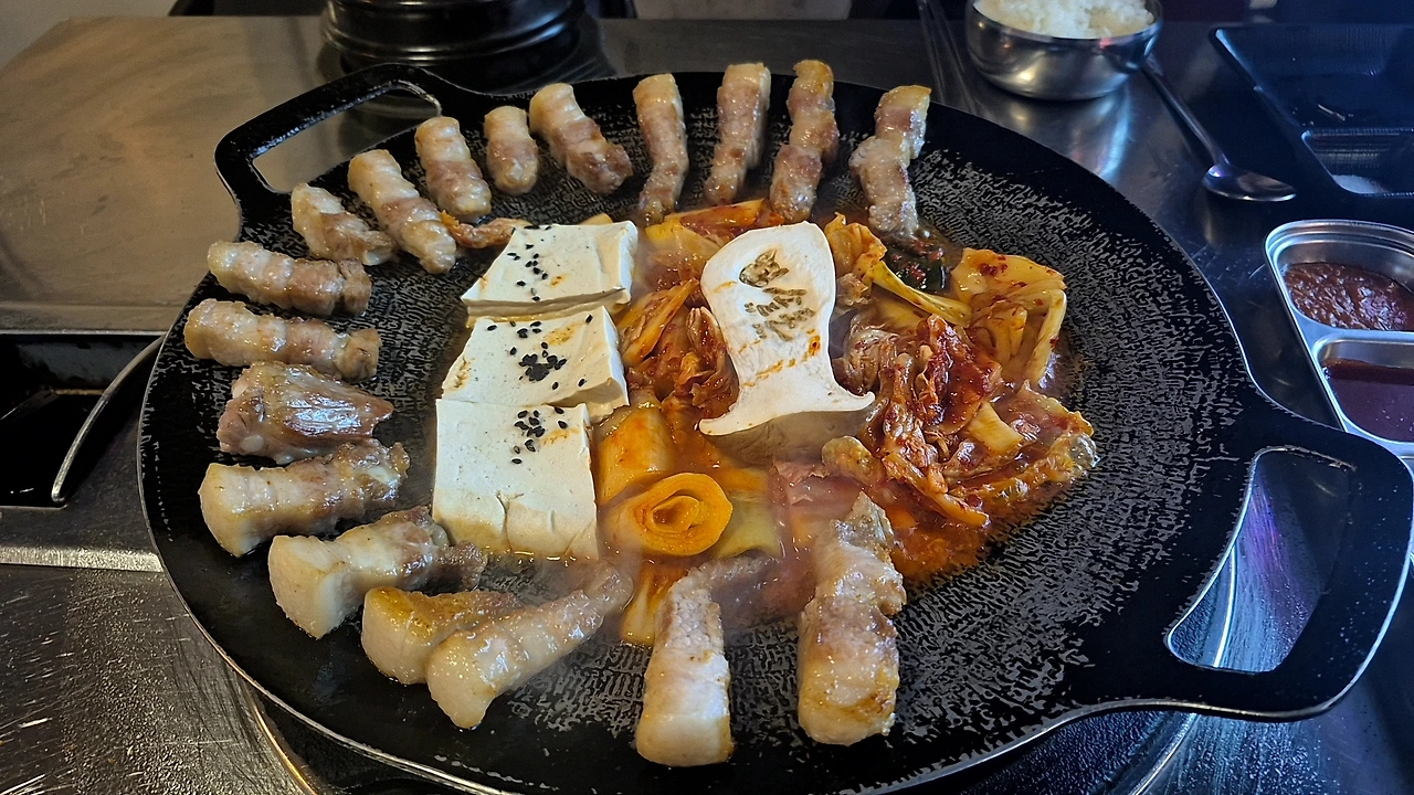 잘린 고기들은 솥뚜껑 가장자리에 가지런히 둘러졌다.