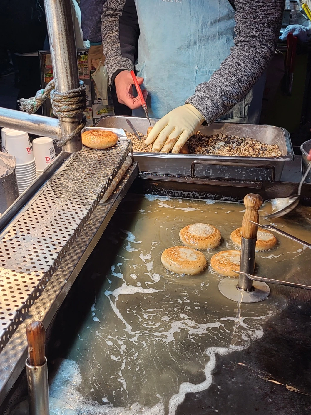 저는 노란색 단호박맛, 남편은 보라색 복분자맛 주문했더니 철판에 지글지글 구워지고 있던 것 중에 잘 익은 것을 골라 주셨습니다. 호떡을 집게로 챡! 집으시고 종이컵에 샥! 넣음과 동시에 반으로 꾸깃! 접어서 주시는 손목 스냅이 바로 그녀의 경력기술서입니다. (센스 있는 분이라면 호떡 색을 발견하셨지요? ㅎㅎㅎ)