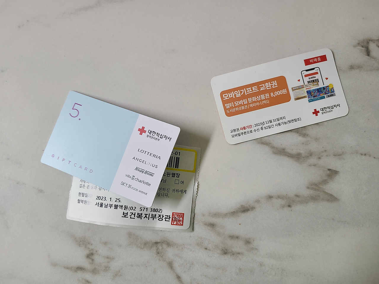 헌혈증과 기념품 상픔권들