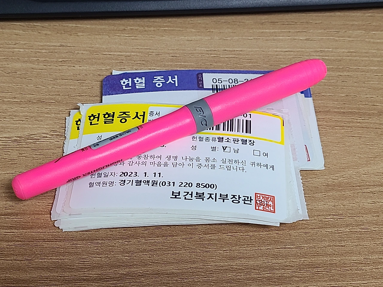 심지어 오늘 남편이 헌혈하고 와서 똑같이 23회 동점이 되었습니다.