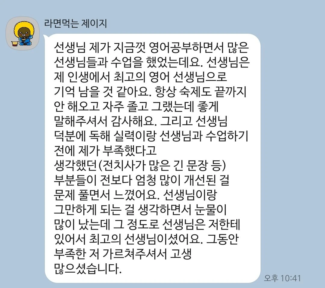 '나는 웃는 얼굴로 아이들을 마주할 것이며 아이들에게 덜 지루하고(안 지루할 수는 없다 ㅎㅎ) 머릿속에 남는 수업을 하겠습니다. 나는 지식을 전달하는 학원강사지만 아이들의 꿈과 생활에도 관심을 가지겠습니다.'