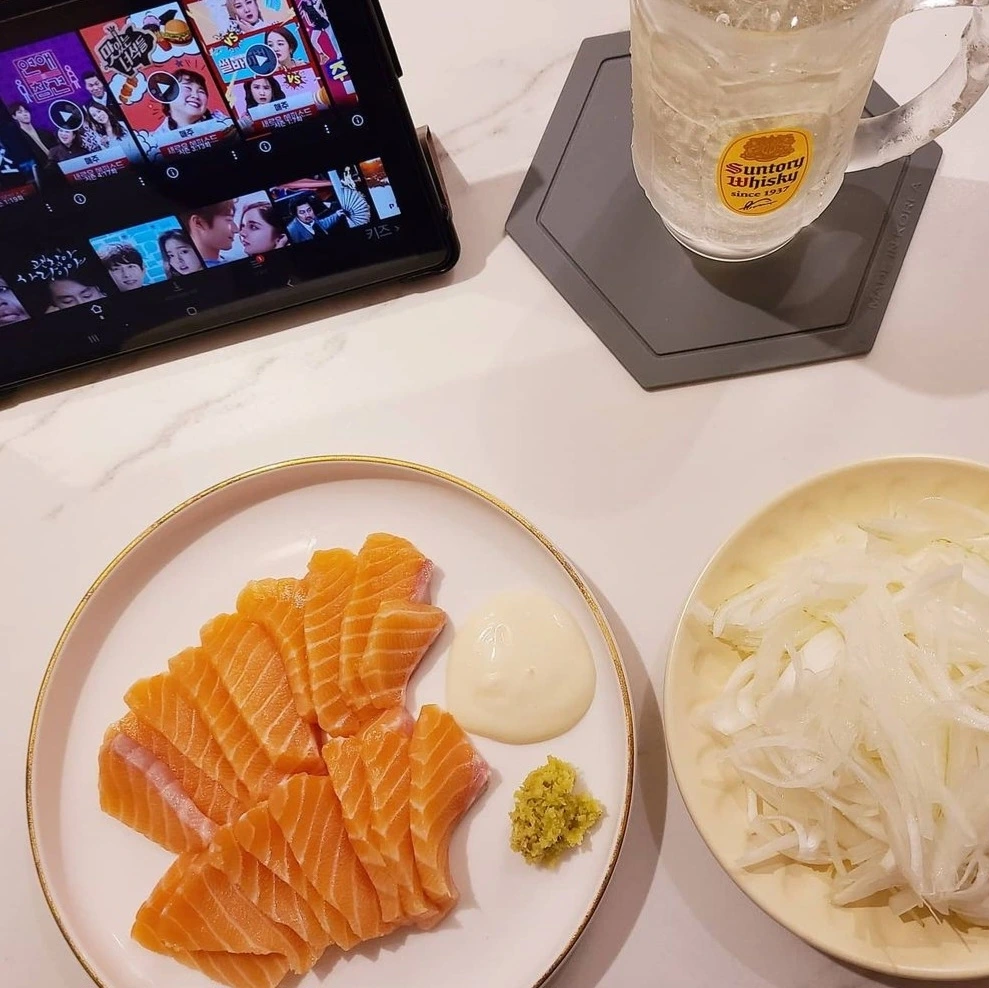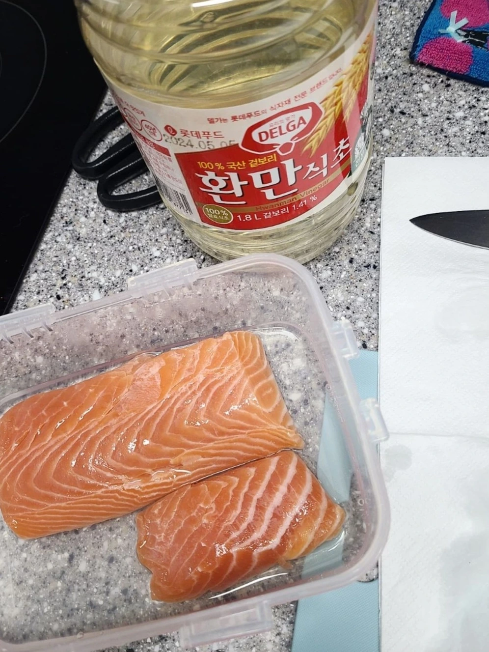 다시마와 청주 숙성을 마친 연어를 살짝 환만식초에 헹궈내서 먹는 것을 좋아합니다.