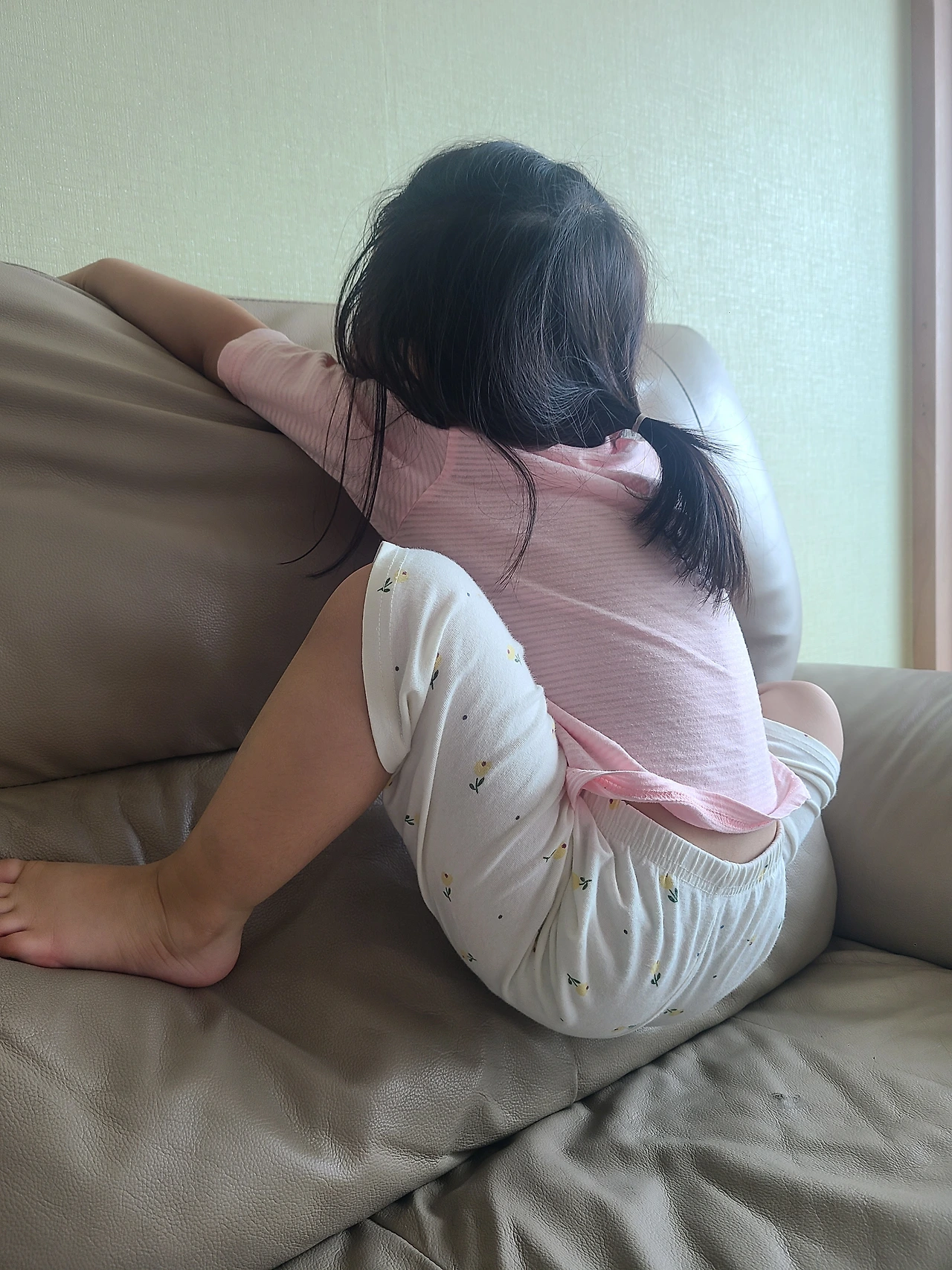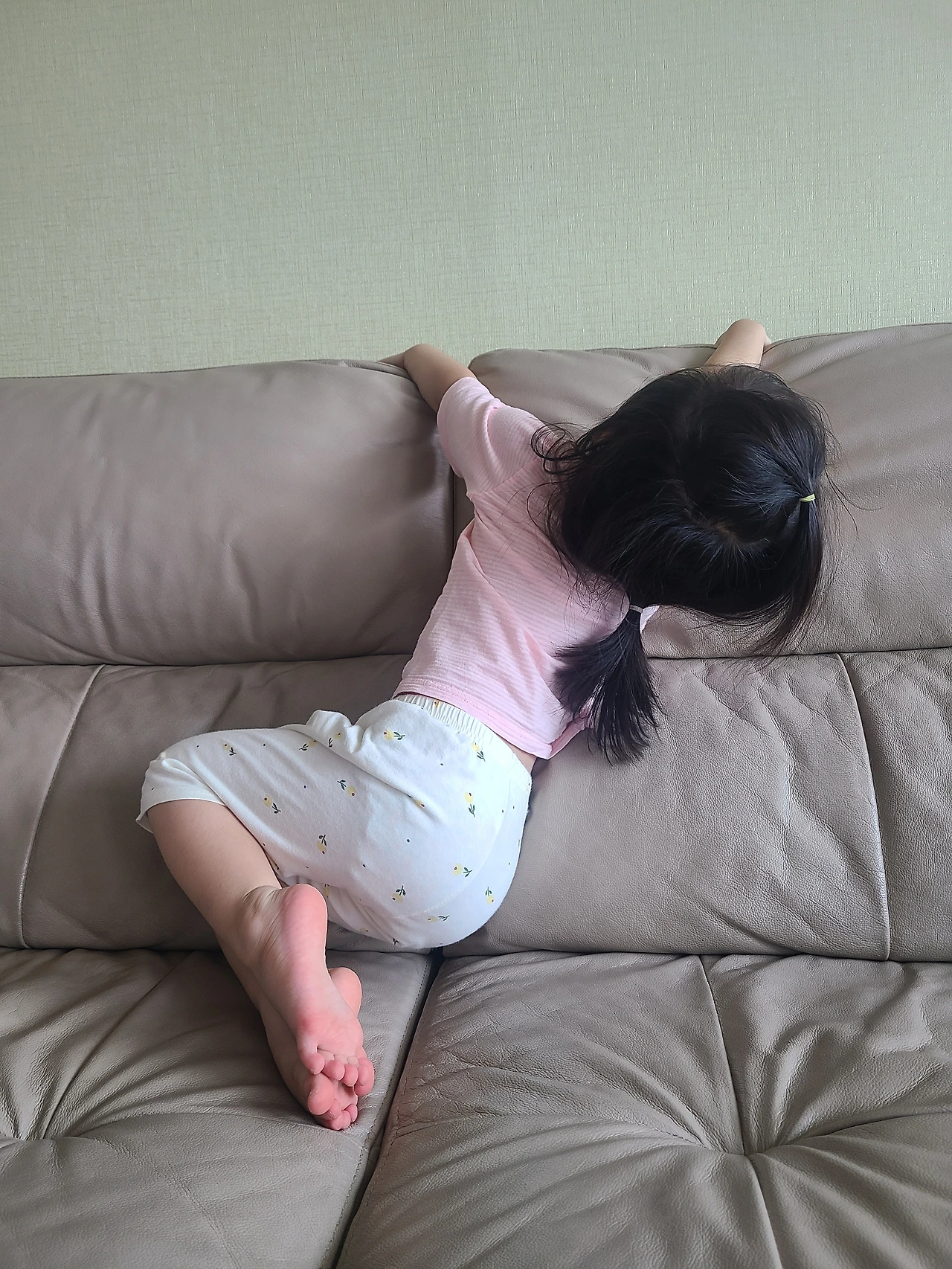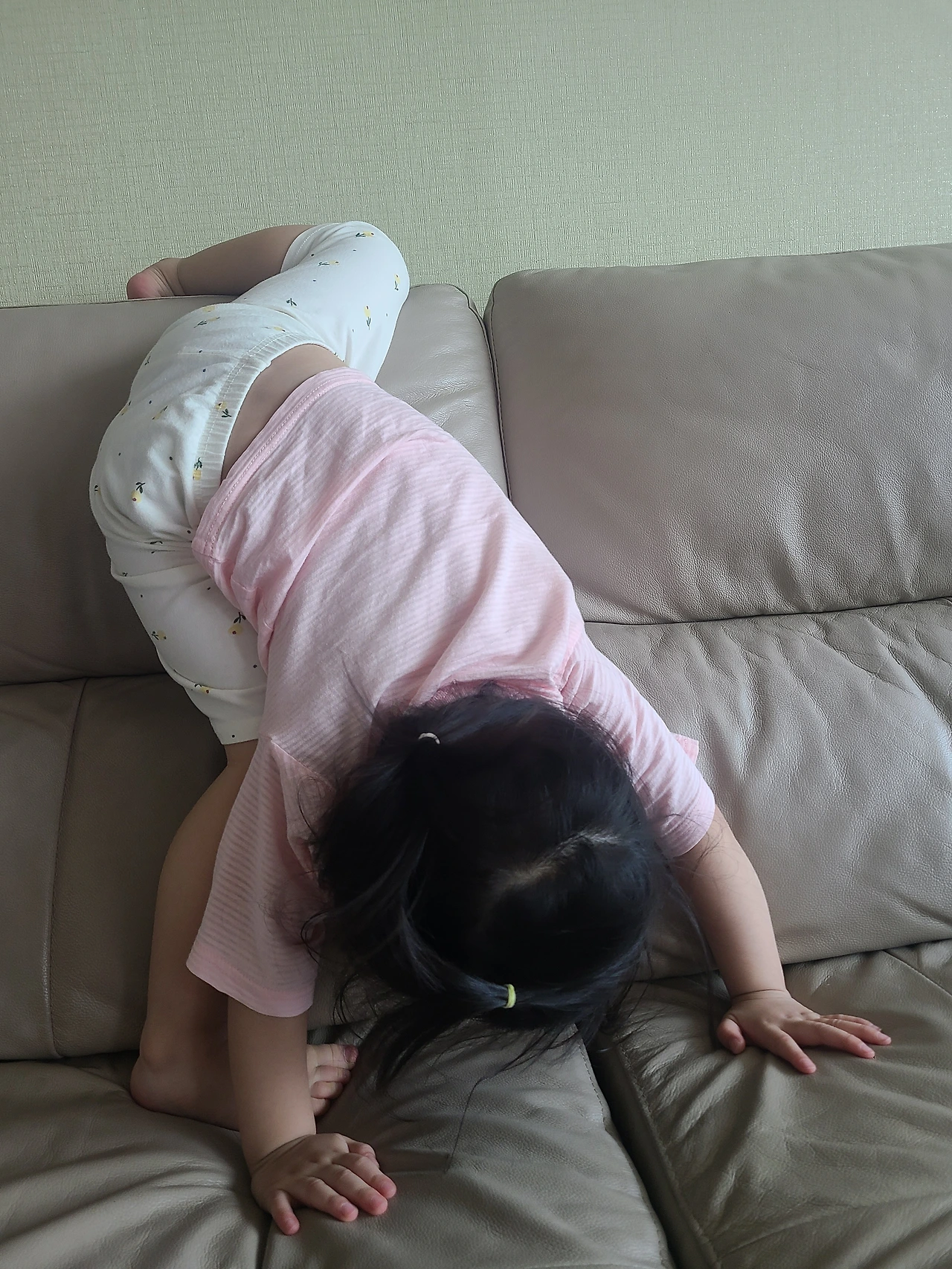 고양이와 인사하고 놀이터랑 도서관도 갔다가 집에 돌아오니 쇼파에서 코어 근육을 자랑하며 괴상한 포즈를 하고 계속 사진을 찍으라고 닦달하는 조카...