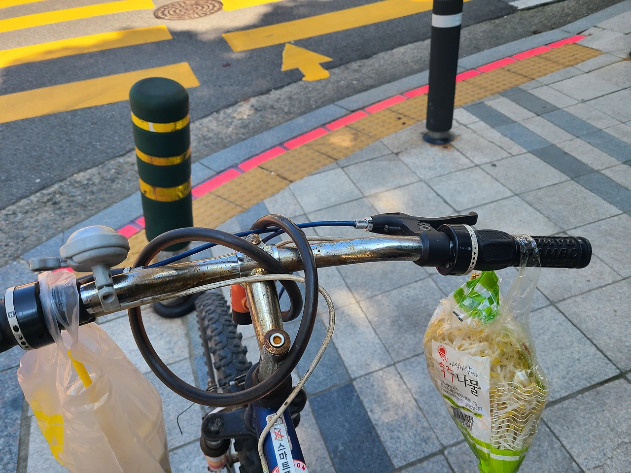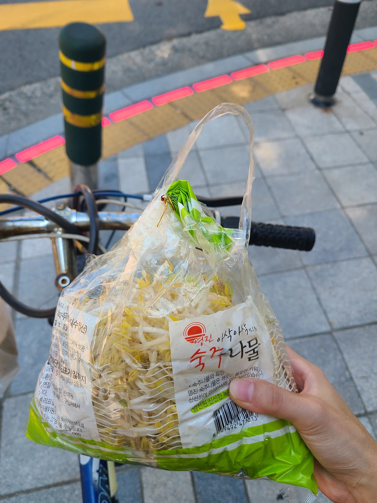 한 손으로 숙주를 들고 남은 손으로 자전거 운전을 할 순 있겠지만 위험하니 그러지 않고 싶었다.