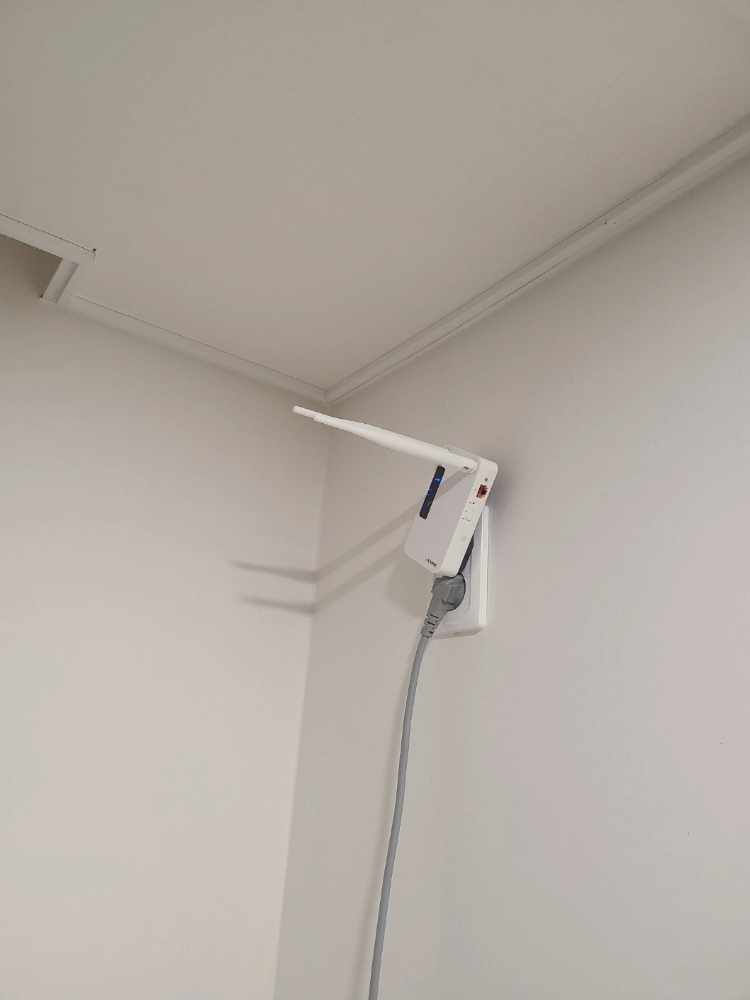 바로 주문해서 거실 구석 천장 쪽에 있는 에어컨용 콘센트에 꽂고, 안방 쪽으로 안테나를 쭉 뻗어 두니 이제 안방에서도 팡팡 터지는 와이파이를 쓸 수 있게 되었다!