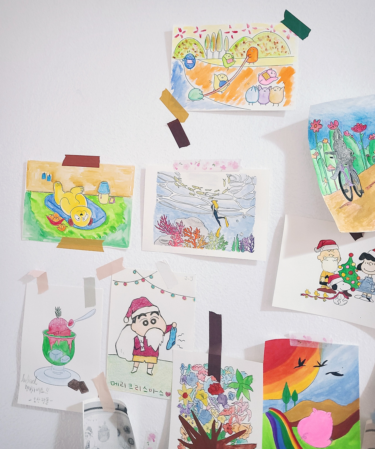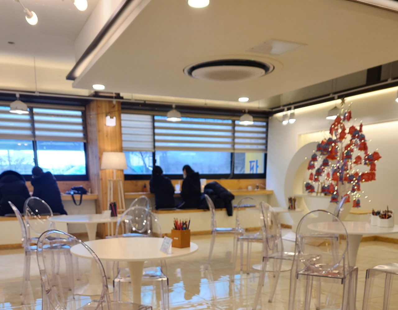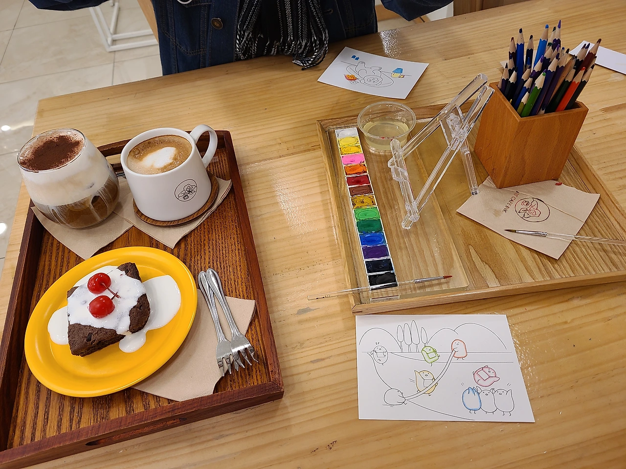 음료를 1인 당 1잔씩 시키면 여러 가지 그림의 윤곽선이 그려진 엽서들 중 마음에 드는 것을 각자 하나씩 고를 수 있다. 2인 당 1개씩 수채화용 미니 팔레트도 준다. 아무 자리에나 맘에 드는 곳에 가 앉으면, 테이블마다 수채화가 부담스러운 사람들을 위한 색연필 또한 준비되어 있다.