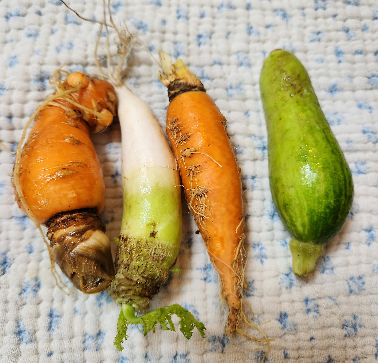 비가 억수로 쏟아진 다음날, 망가진 화분에서 아직 덜 자란 당근과 무, 호박을 가져와 씻었다.