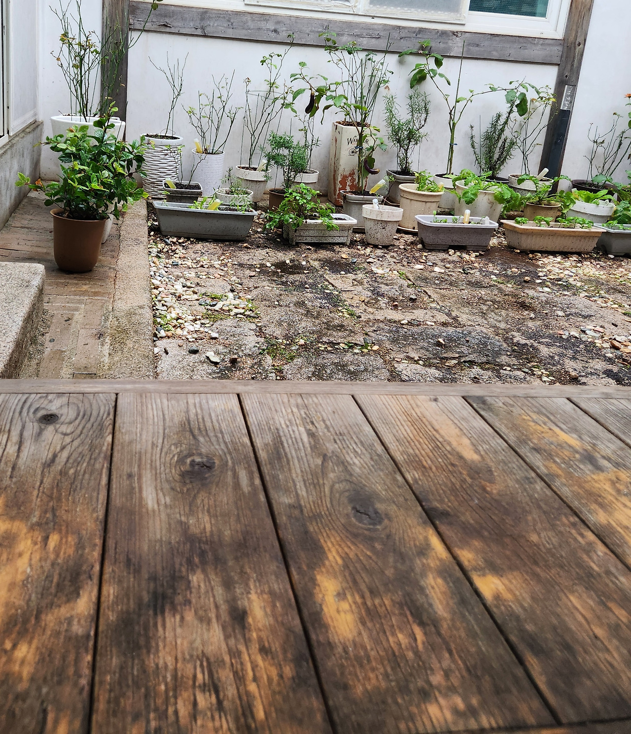 마당에 떨어지는 빗소리를 들으며 마시는 커피.