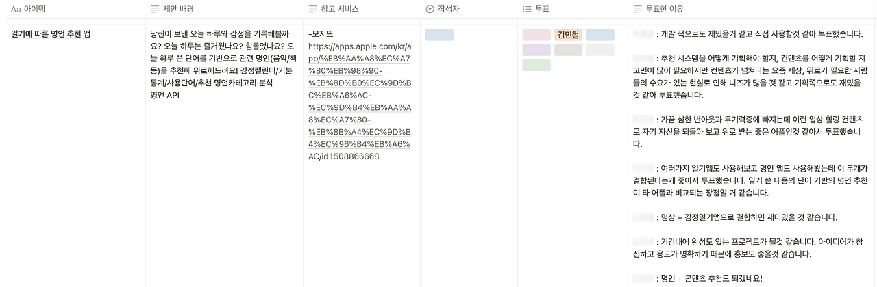 회의 전 까지 모든 팀원들이 이번 프로젝트에서 만들고 싶은 서비스를 각자 1개 이상 노션 페이지에 작성한 뒤 진행하고 싶은 서비스에 투표를 진행했다. 재밌는 아이디어가 많았지만 쟁쟁한 후보들을 모두 이겨내고 '일기에 따른 명언 추천 앱'이 선정됐다.