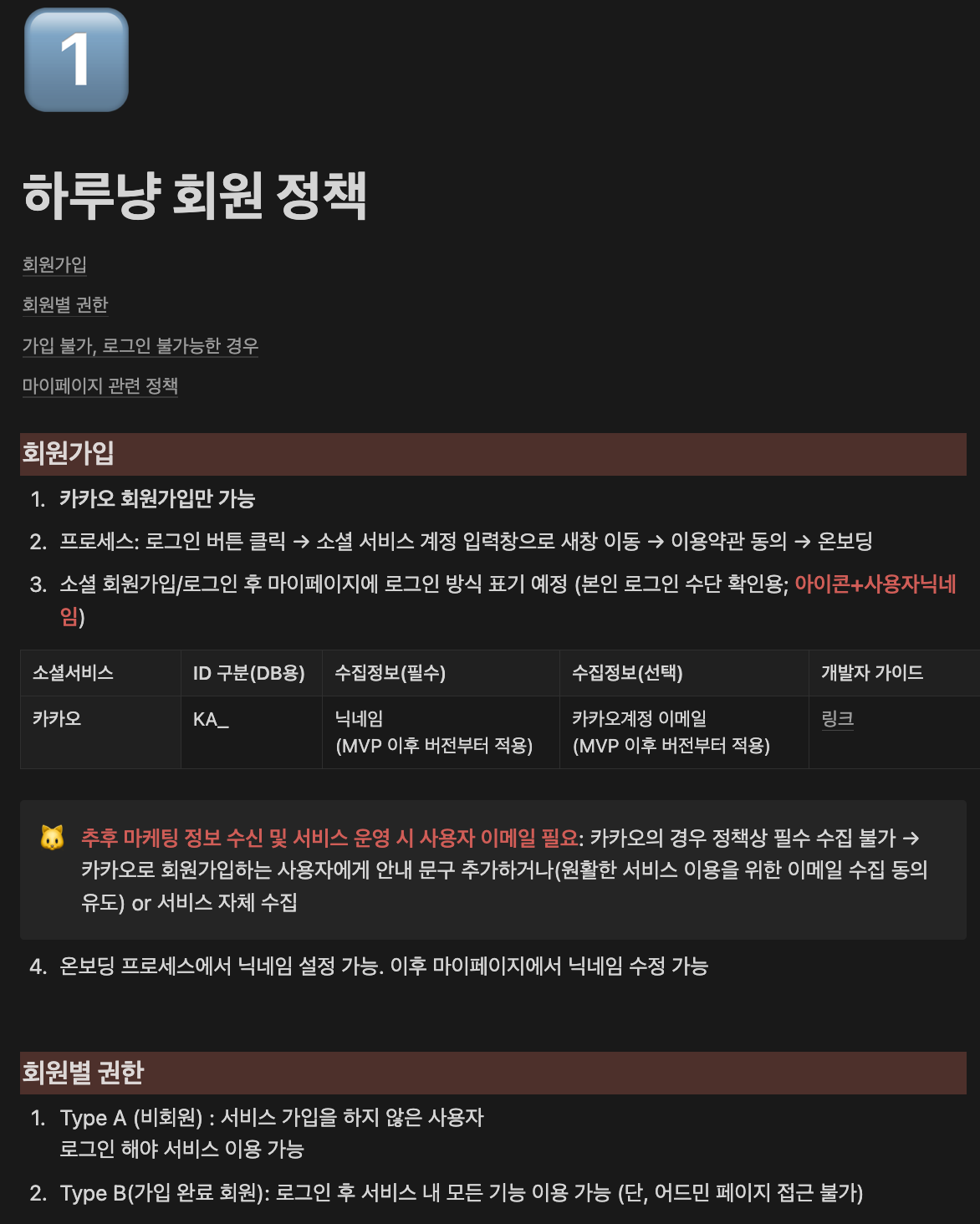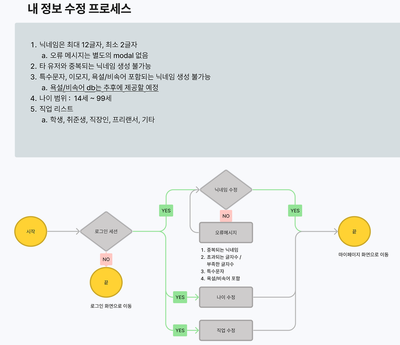 주요 컨셉과 기능을 정했다면 사용자가 서비스 내에서 어떻게 행동을 하는지 루트를 설계해야 한다. 이때 사용자 권한, 서비스 정책을 고려해야 한다. 그러나 우리팀은 프로세스부터 설계했기 때문에 마땅한 서비스 정책이랄 것이 추상적인 아이디어만 있었을 뿐 구체적인 문서는 없었다. 따라서 프로세스를 하나둘씩 그려가는 과정에서 개인정보, 서비스 운영처럼 깊게 고민해야 할 내용들이 생각나면 장표 상단에 따로 메모했다.