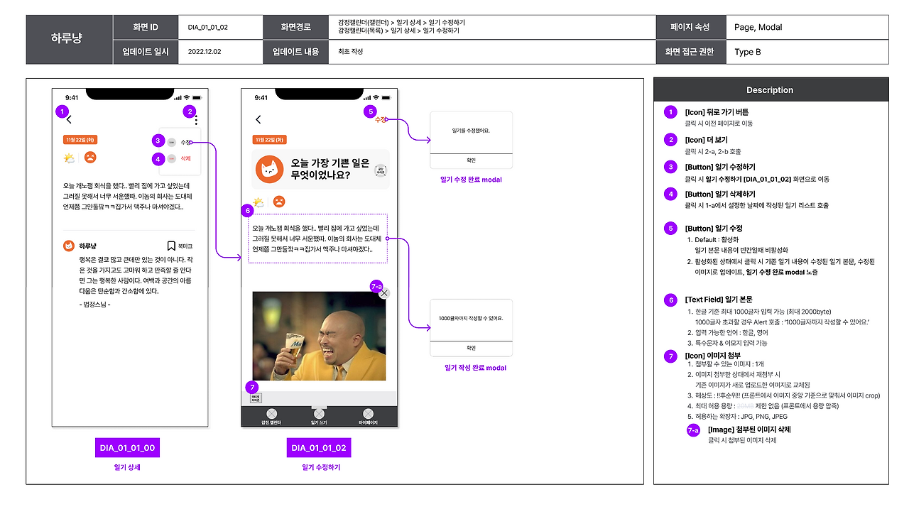 모든 팀원이 가장 많이 보는 문서인 만큼 피그마 코멘트가 가장 많이 달렸고 수정도 많았다. 화면설계서는 디자인 되기 직전, 앞서 작성한 프로세스 흐름대로 화면을 그린다. 여기엔 그 어떠한 디자인도 들어가면 안 된다. 기획자가 디자이너의 감각과 사고를 방해할 수 있기 때문이다(이러한 이유 때문에 왠만한 화면설계서는 ppt로 일부러 못생기게 작성한다.). 실시간 협업을 위해 피그마로 작성해서 디자인적 요소를 100% 덜어내긴 힘들었지만 디자이너 팀원들에게 절대로 화면대로 디자인하면 안된다고 수시로 요청드렸다.