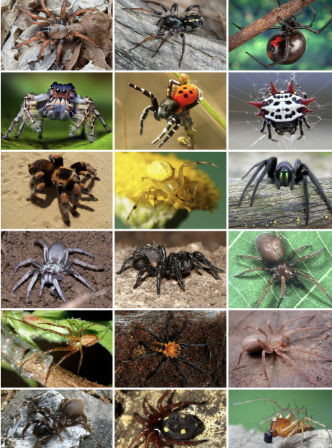 현재까지 밝혀진 거미 종은 5만 종 이상, 실제로는 10만 종에 달할 것으로 추정된다. 지구 어딜 가도, 극지방을 제외하고는 거미가 산다. 개체수로만 보면 수 조 마리 이상으로 추산된다.