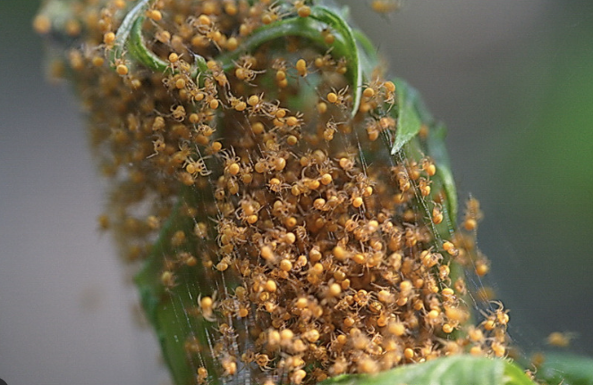 부화한 새끼 거미들은 알주머니 안에서 잠시 머물다가 밖으로 나온다. 일부는 어미 등에 올라타 보호받
