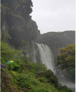 폭포는 정방 폭포와 비슷한데 굵은 물줄기가 한 개 더 많은 세갈레 길이다. 폭포의 떨어지는 포말이 물안개가 되어 연기처럼 옆으로 퍼져 나간다. 폭포 위의 우거진 밀림은 온통 하늘을 뒤덮었다.
