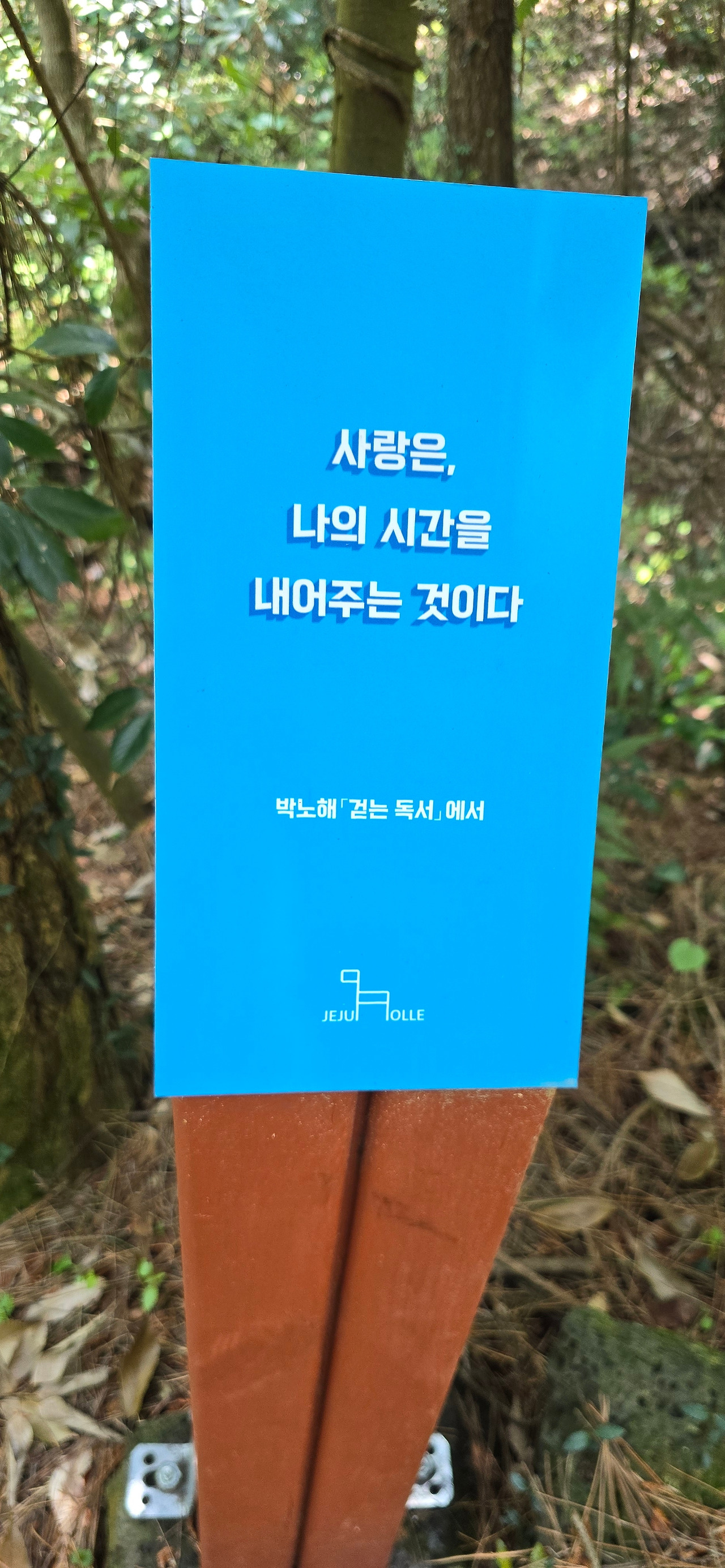 100여 미터 높이로 아주 낮은 오름이지만 의외로 가파르다. 오르는 길에 표현 어린이집 유치원생들의 푯말이 힘을 북돋아 준다.