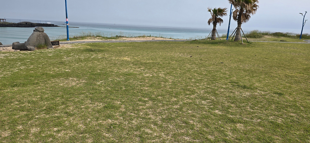 호텔을 나와 백사장 근처 넓은 잔디에 앉았다. 함덕비치의 에메랄드 바다는 멀리 넓게 퍼져 있다.