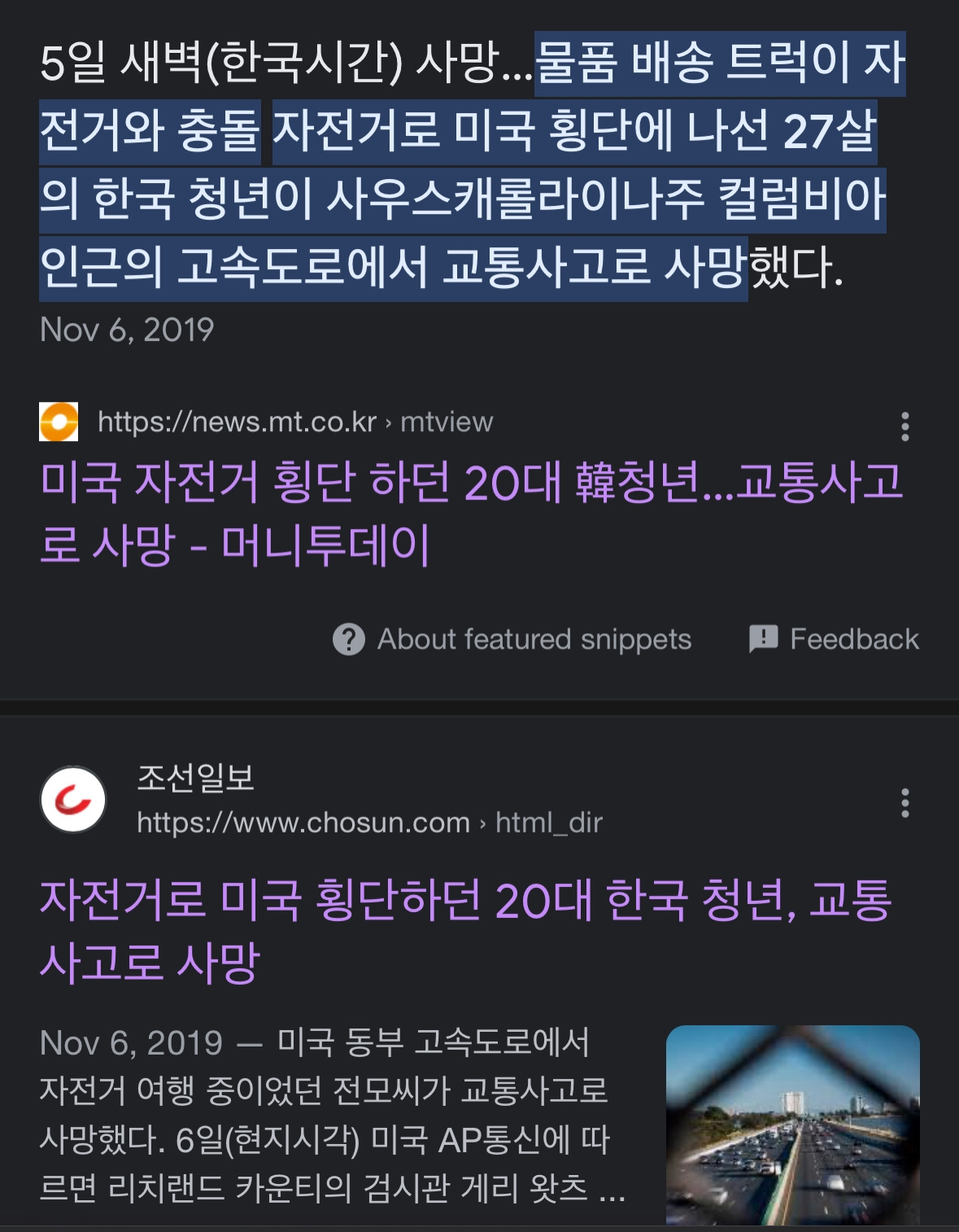 자전거로 미국 횡단을 하던 전 씨가 고속도로에서 차에 치여서 숨졌다는 내용이었다.