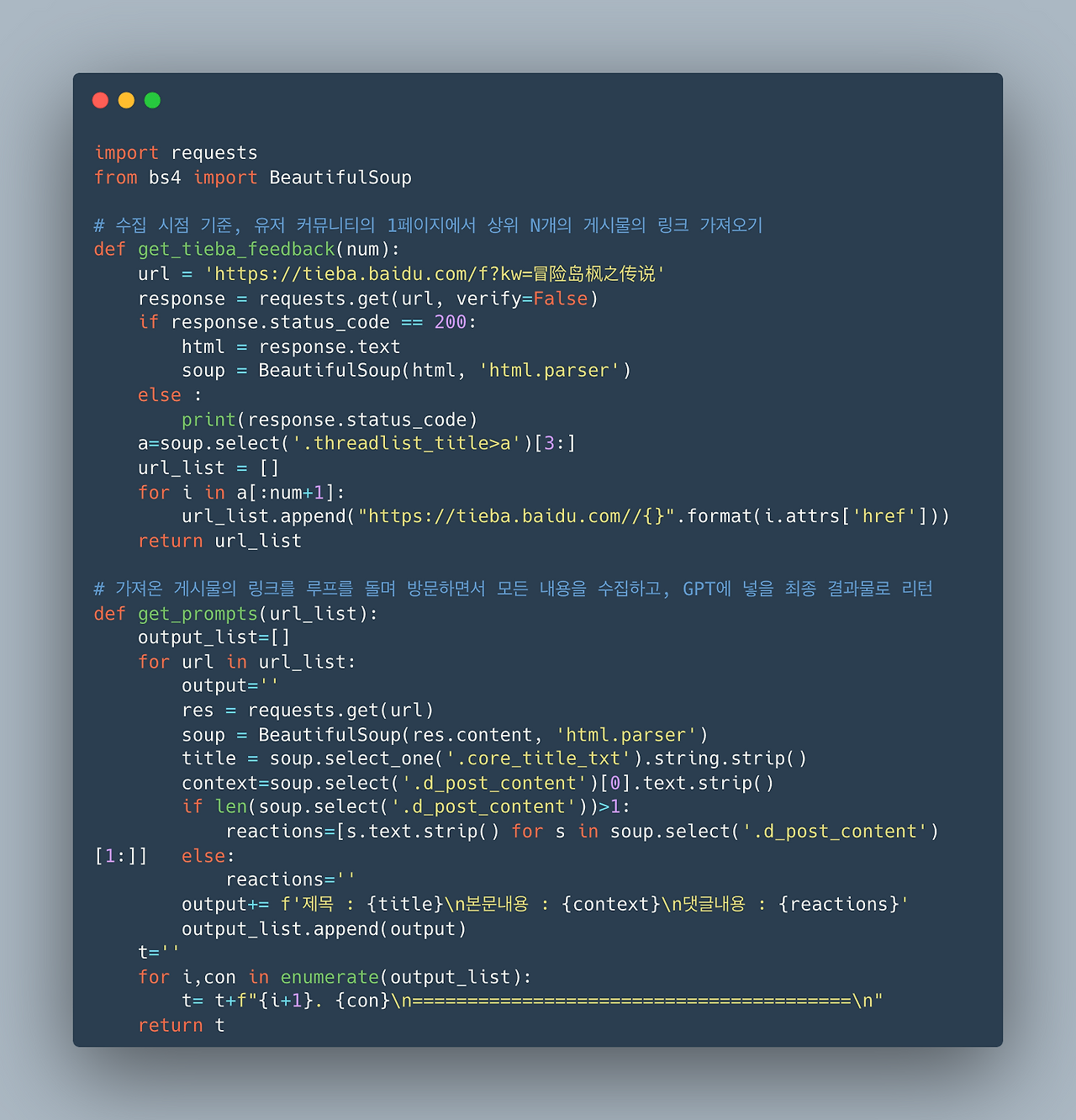 eric_tieba_crawling 모듈안에 두개의 펑션을 만들었고, 우선 필요한 URL들을 수집한 뒤에, 해당 URL을 루프를 돌며 방문하면서 GPT 질문에 필요한 모든 내용들을 모아서 하나의 context로 만들어주었다.