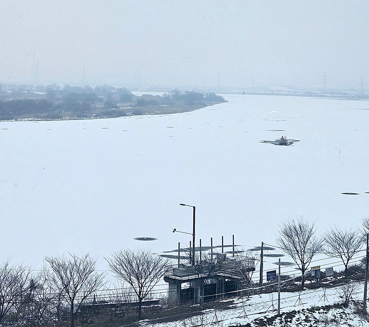 타워에서 바라본 전경, 평택강이 얼어서 눈으로 덮였다