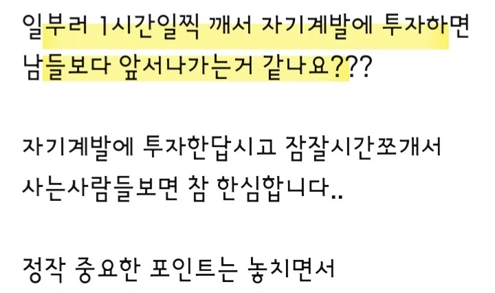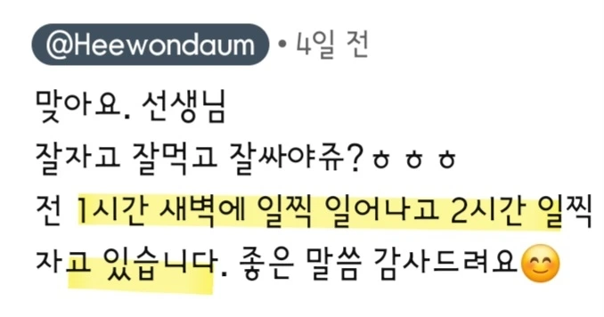 2시간 일찍 자고, 새벽에 1시간 일찍 일어나기 시작했다는 영상을 올리자 댓글이 달렸다. 어련히 알아서 조절했을까, 충고를 서슴지 않는 사람들이 참 많다. '아휴... 참 오지랖은', 그래도 시간 내서 봐준 게 고마워 나이스하게 대답했다.