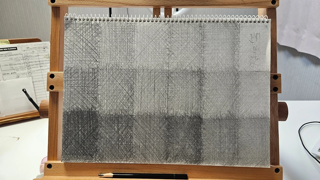 명암을 표현하는 것 역시 난제였다. 연필로 선을 사용해 사물의 형태와 명암을 표현하는 소묘에서는 명암만 제대로 차이를 내도 뭔가 있어 보이는 그림이 나온다. 그런데 내가 2주 차부터 5주 차까지 가장 많이 들은 피백은 '희원님, 손에 힘 빼세요'였다. 잘 그리고 싶은 마음에 힘이 잔뜩 들어간 게 역효과가 난 것이다.